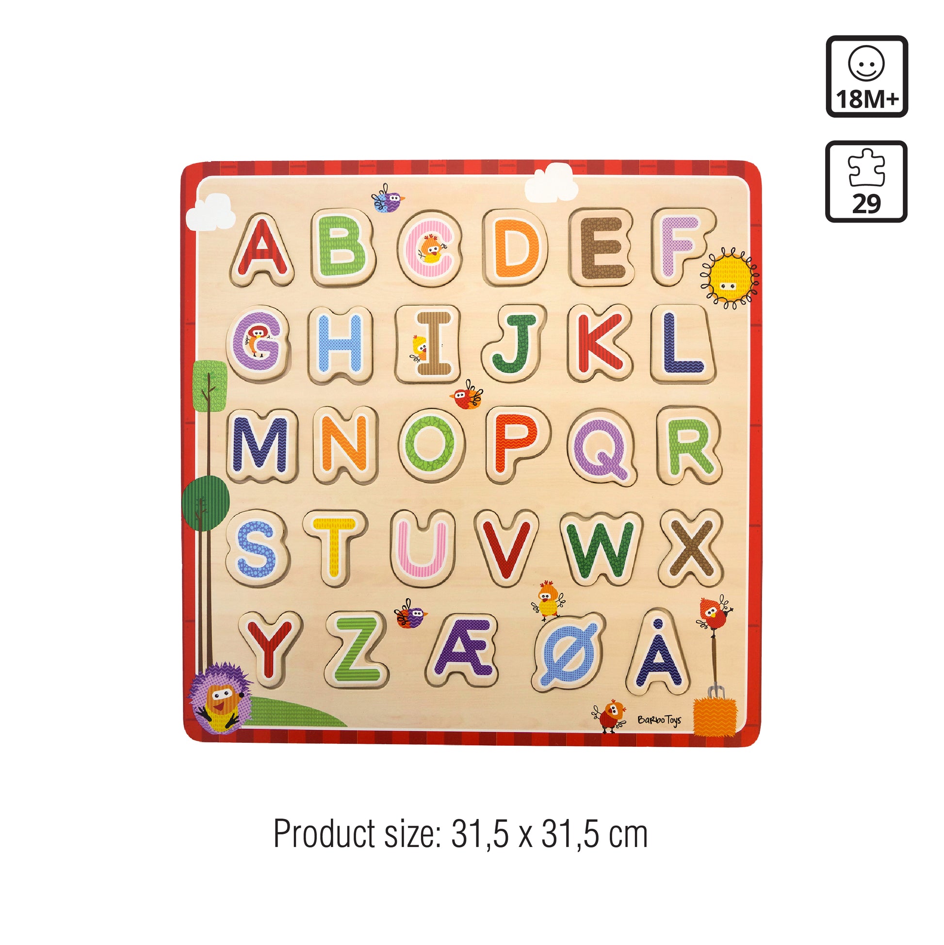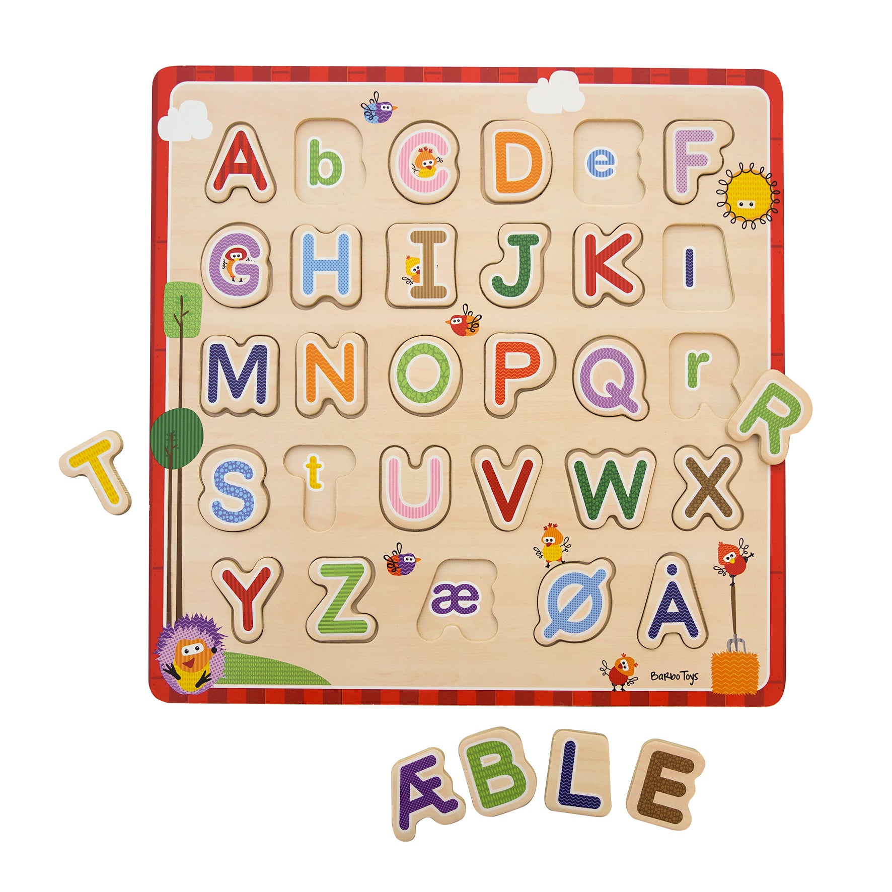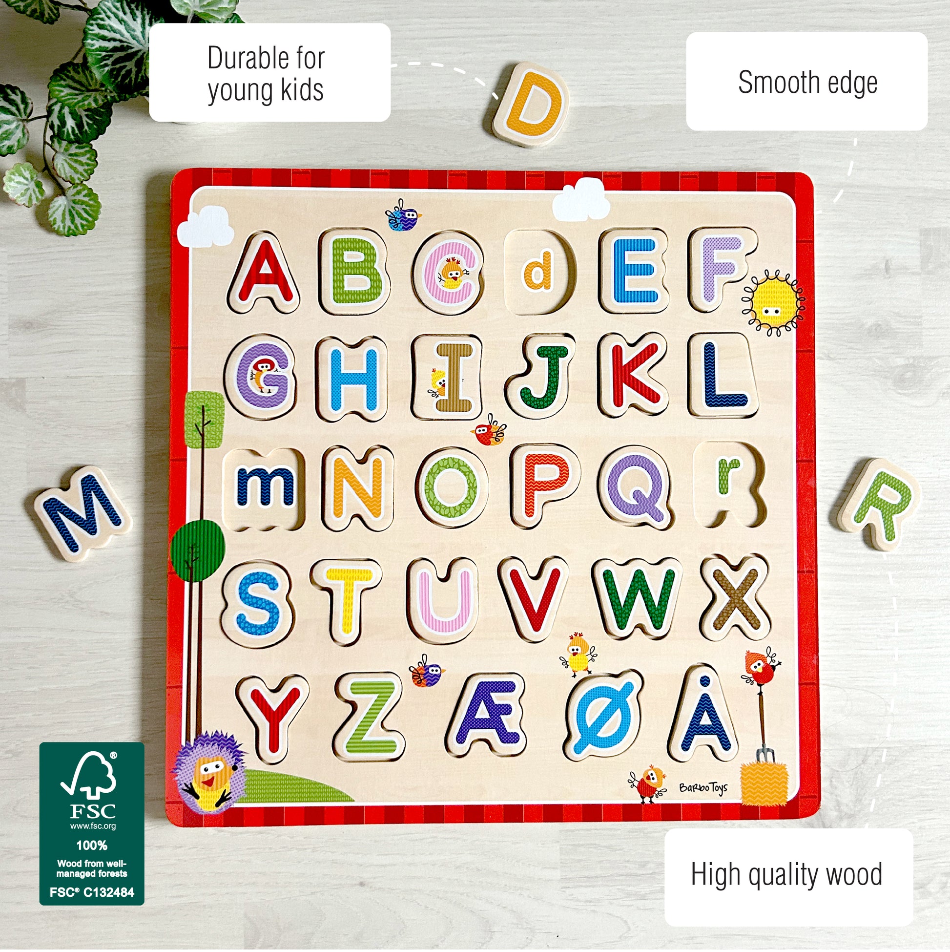 Teach your child the Danish alphabet with this cozy wooden puzzle. Practice the alphabet by putting together the puzzle and strengthen the child's letter learning, sense of shapes, color recognition and hand-eye coordination. The wooden puzzle is a playful and pleasant way to learn the alphabet, as well as getting to know the upper and lower case letters of our alphabet.