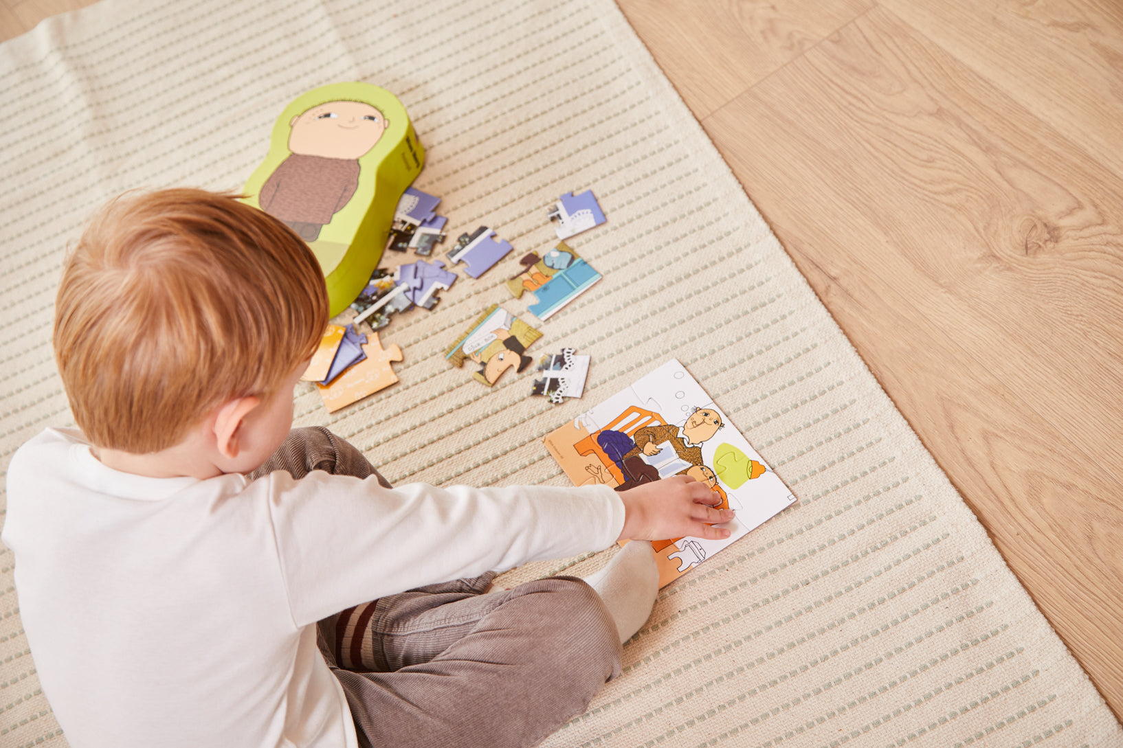 This puzzle arrives in a funny and cute shaped box where you must help Alfons Åberg by placing all the pieces together. The puzzle contains large puzzle pieces which makes it easier for the child to hold and place the pieces in the right places. The product contains 3 puzzles.