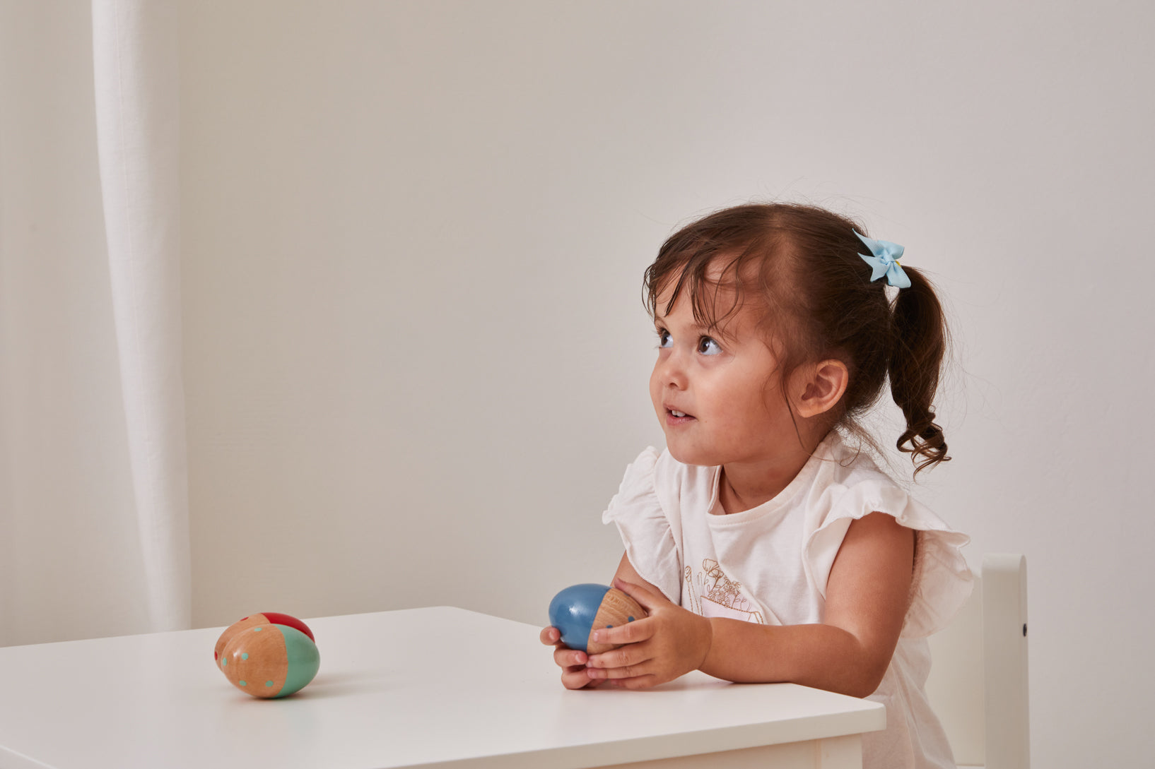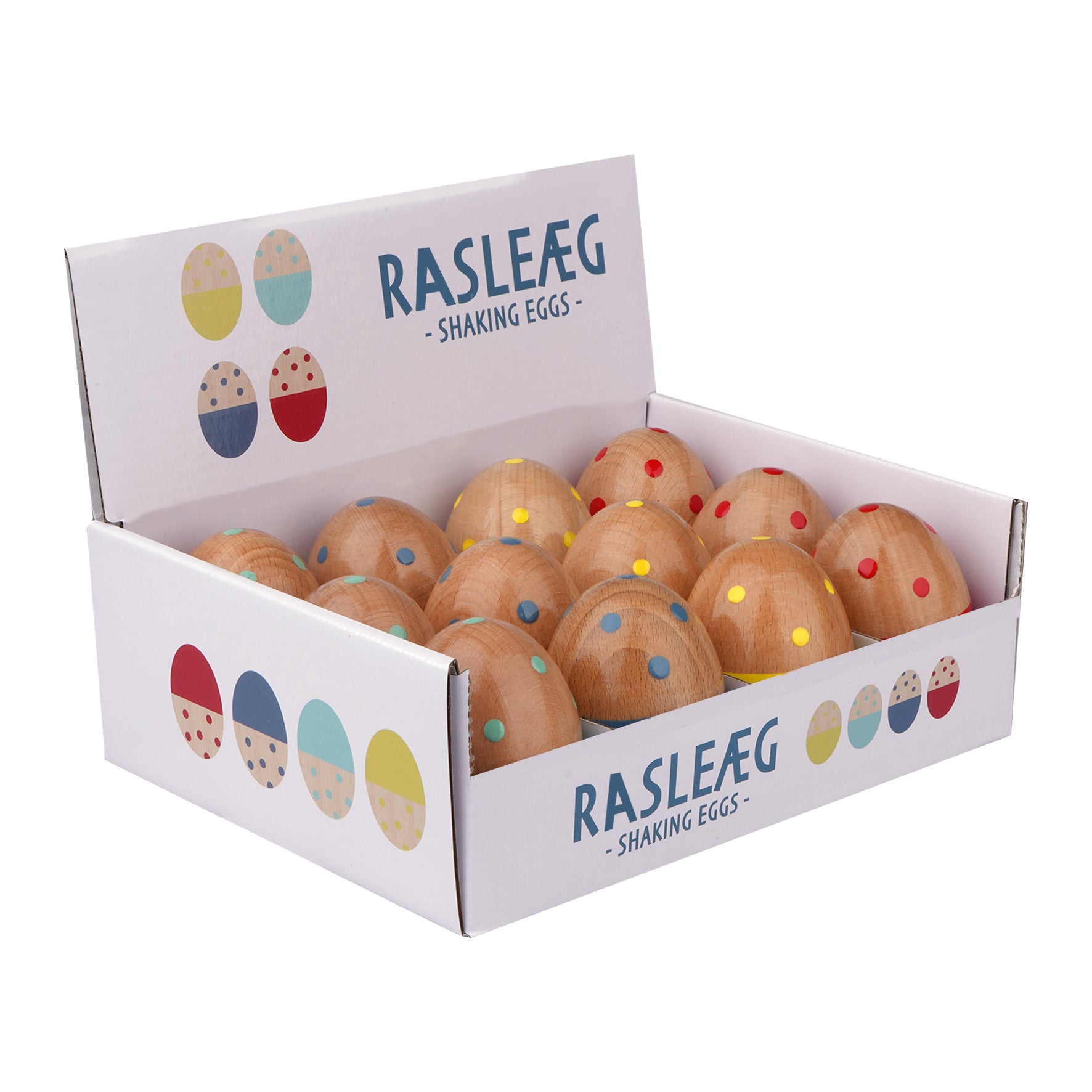 Use the rattling eggs, while you sing a song together with your child. Shake the rattle egg to the beat of the song, or let your child rattle to the rhythm of the song. A good and stimulating play for the child's hearing could be to store the rattle egg in the child's pocket or hood. When the child moves, the rattle egg will secrete sounds and the child will then have to find the egg by listening to where it is hiding.