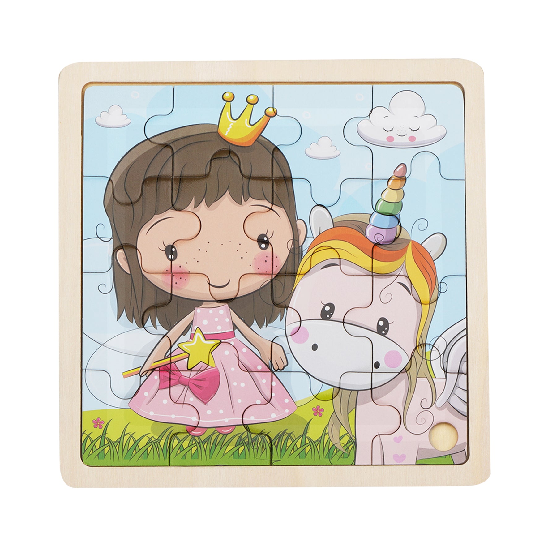 This adorable 16-piece puzzle features Lillie the princess and her magical unicorn friend Ellie in a bright and dreamy scene. Perfectly designed for small hands, the sturdy wooden pieces help little ones develop fine motor skills, concentration, and problem-solving abilities -all while sparking imagination and storytelling.