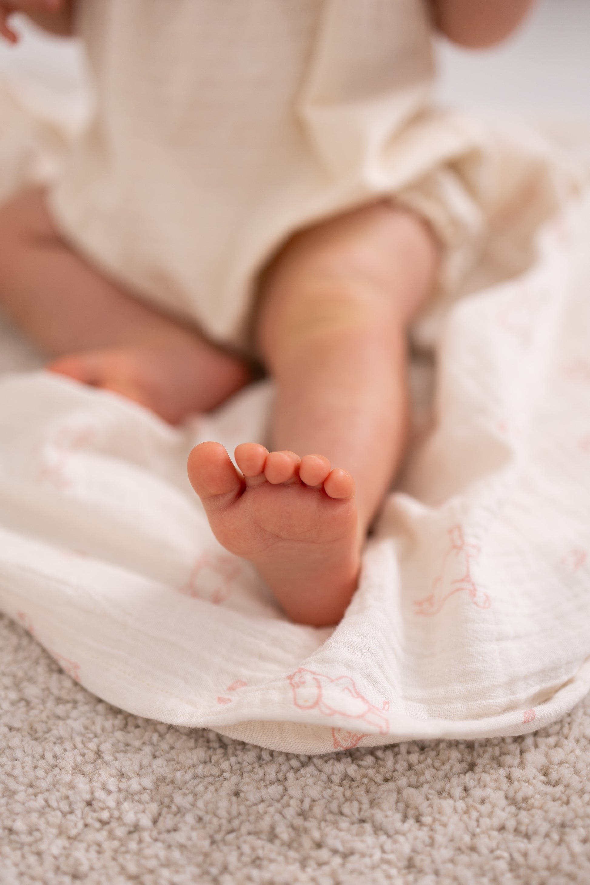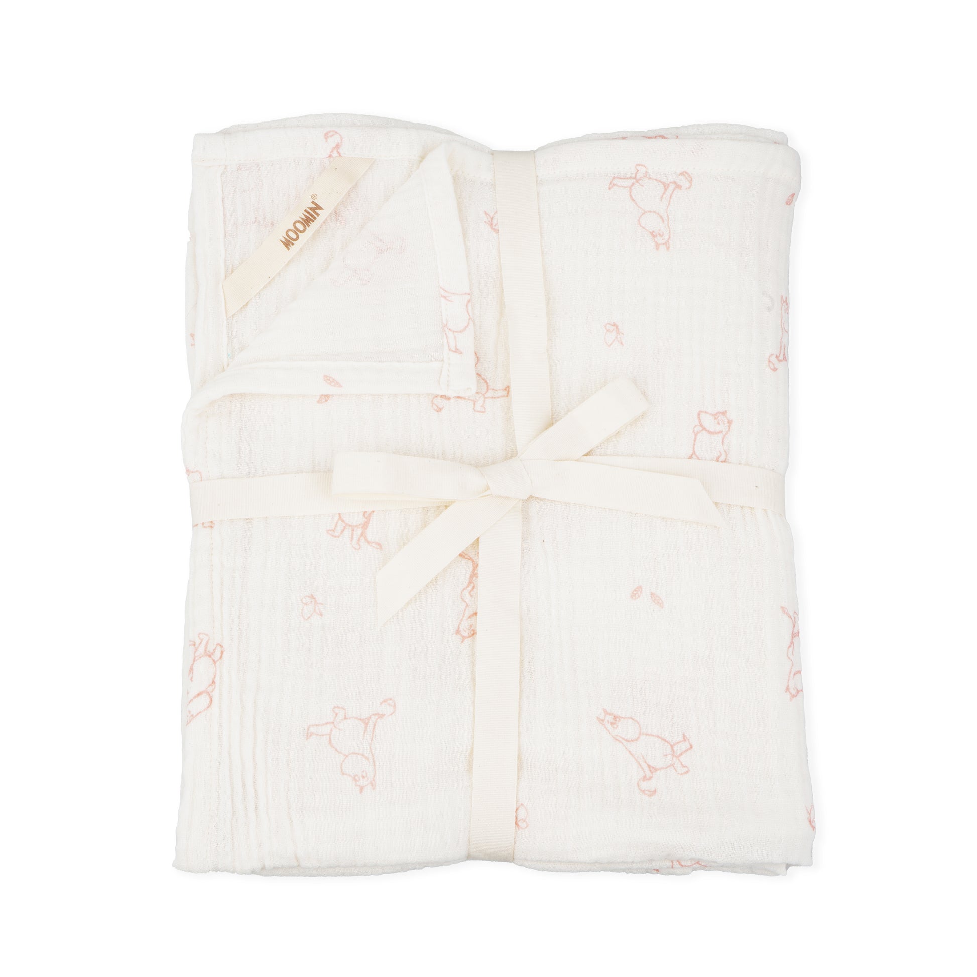 The generous 120 × 120 cm size makes it a versatile everyday essential that grows with your baby and can be used again and again in many situations. The soothing soft pink tone is paired with charming Moomin illustrations, adding warmth, nostalgia, and a playful touch to both nursery spaces and moments on the go.