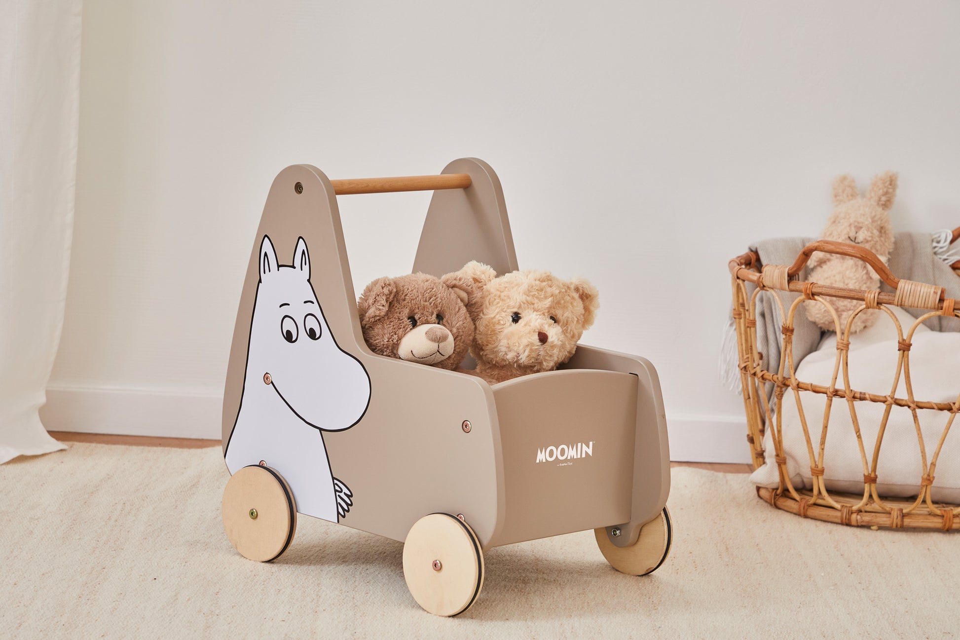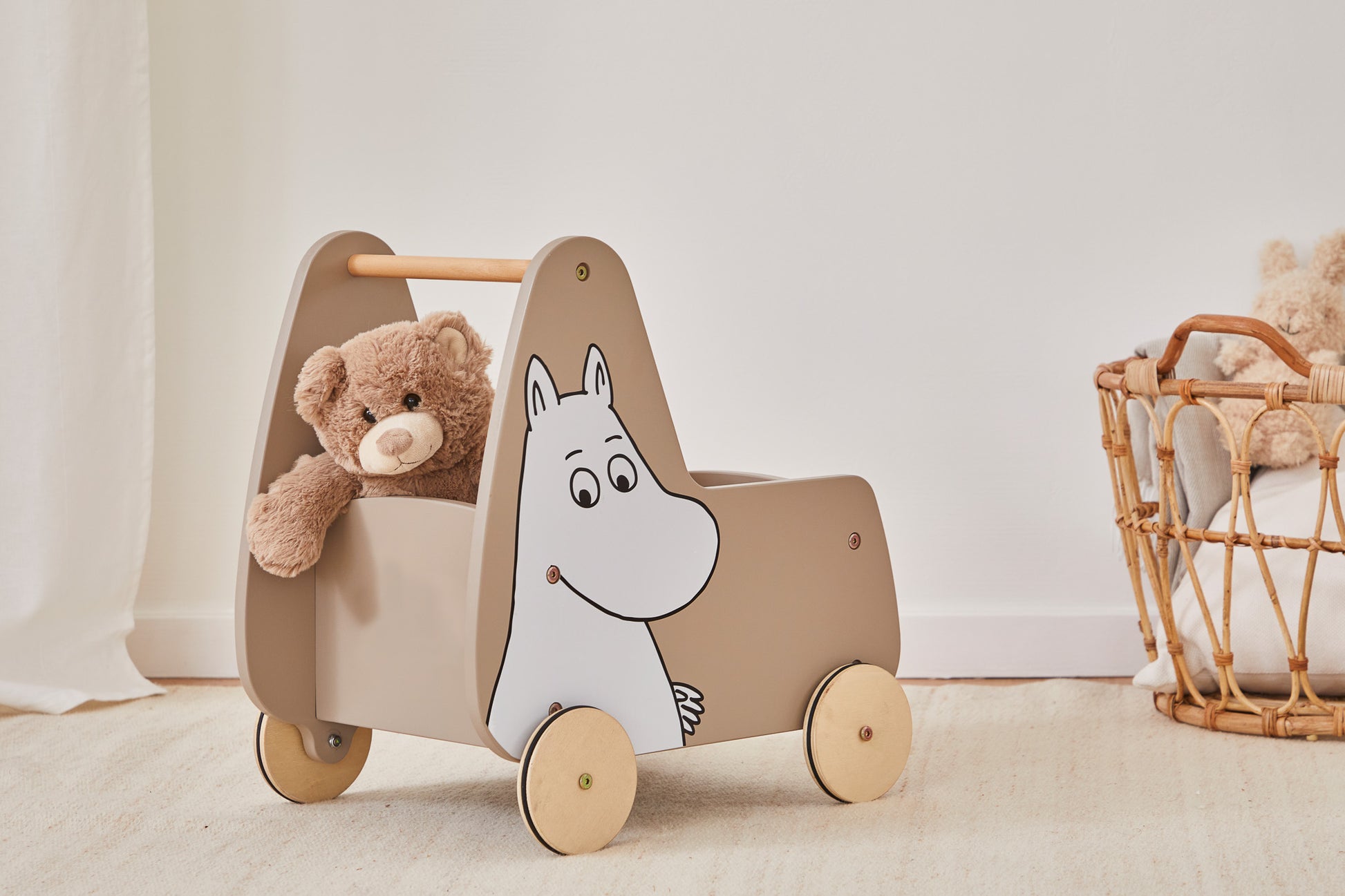 The soft beige color complements any room decor, while the cheerful Moomin character on the side adds a playful touch. The Moomin Stroller is not only a fun toy but also an excellent tool for developmental learning. As children push the cart, they develop their balance and coordination, crucial for their physical development.