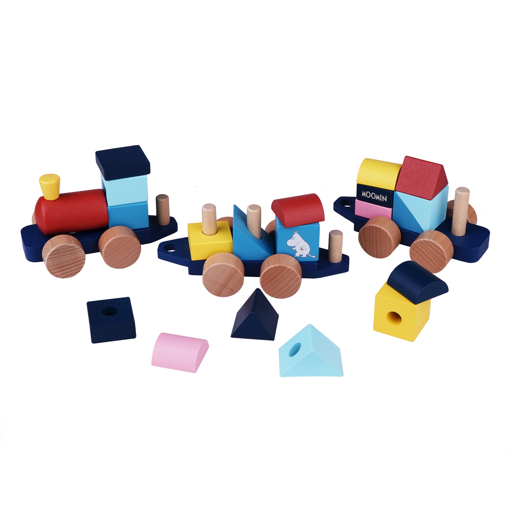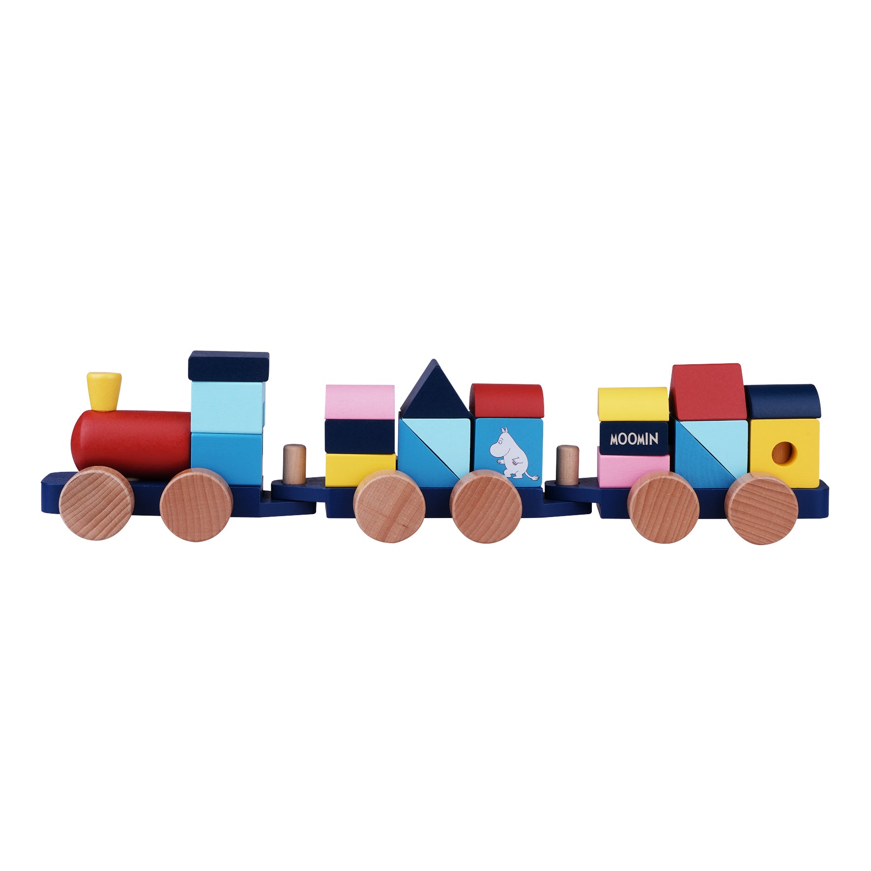 Super cute Moomin wooden train with stacking blocks on the train carriages which have different shapes and are put together to make a beautiful train.