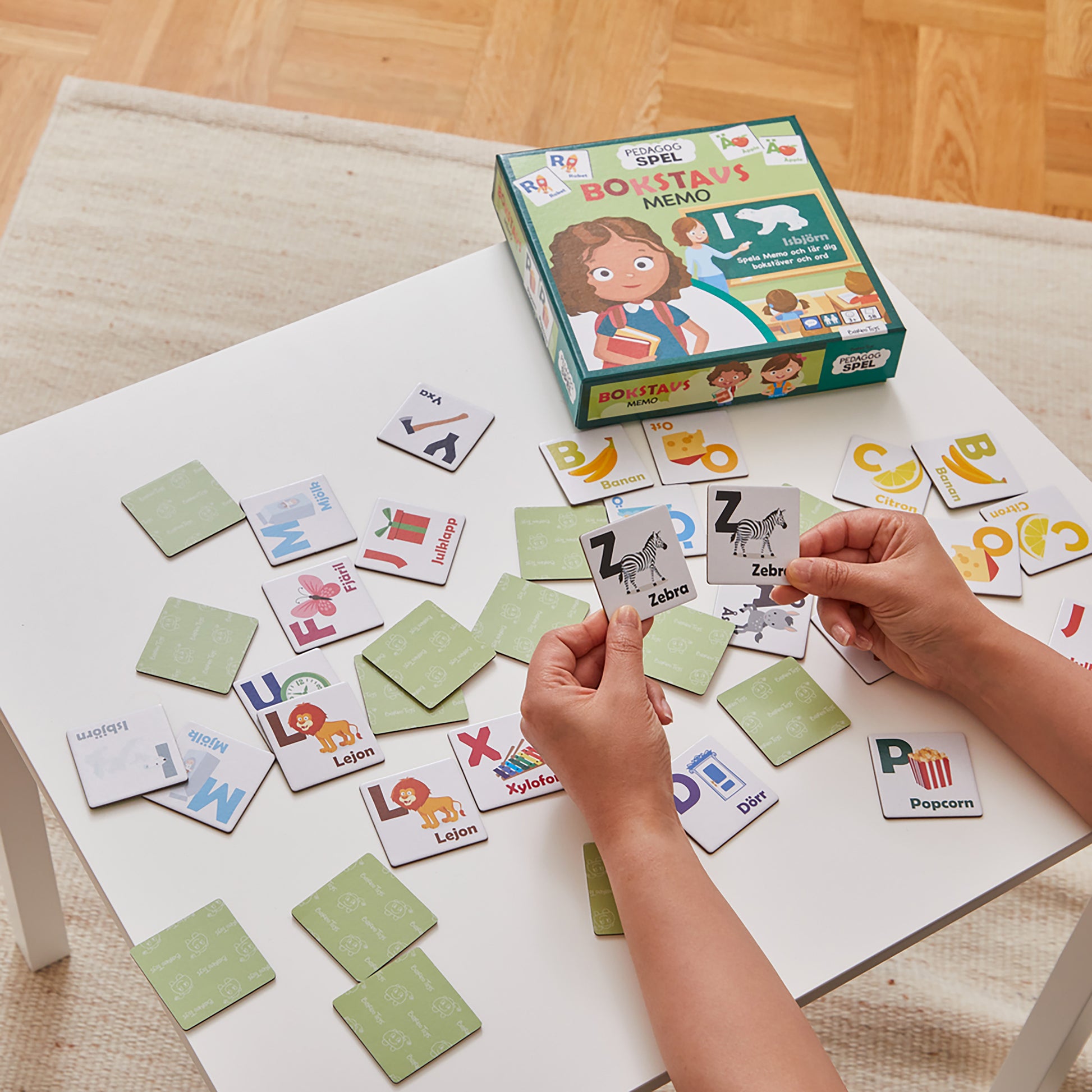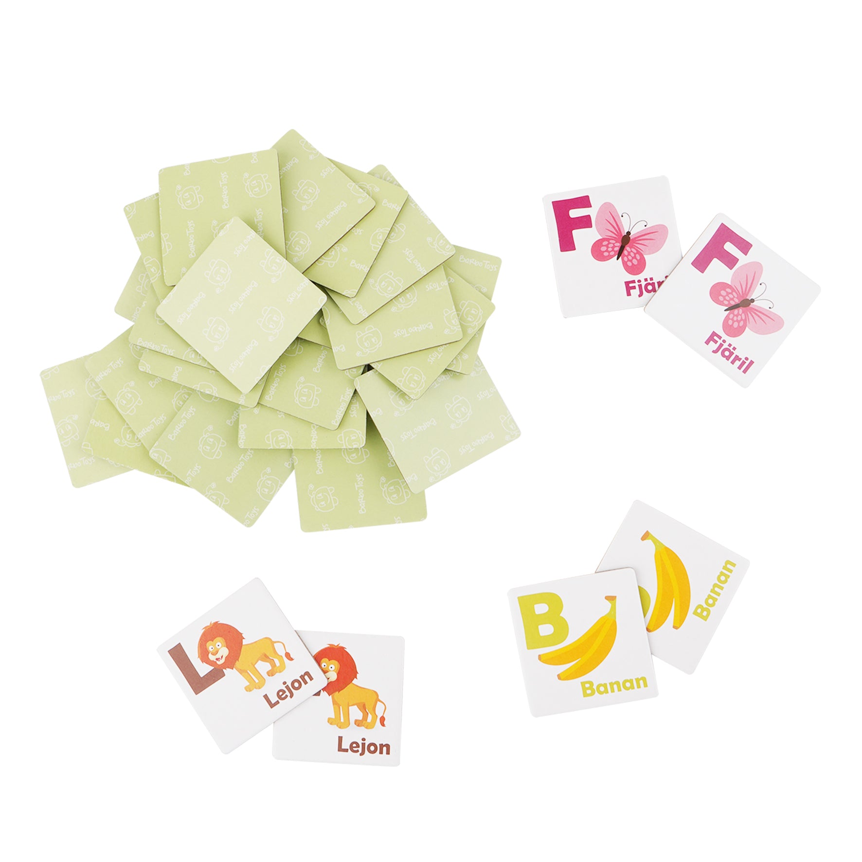 Start the game by placing the cards face down, in random order. A player then turns over any two cards to see if they match each other. If they match, the player gets to keep them and turn over two more cards. The player continues playing until he or she cannot find a match. If the cards do not match, the player turns the cards face down again in the same location and the next player takes the turn. On each card there is a letter, a word and a motif that matches the word. This way you can teach your child about the word on the card.