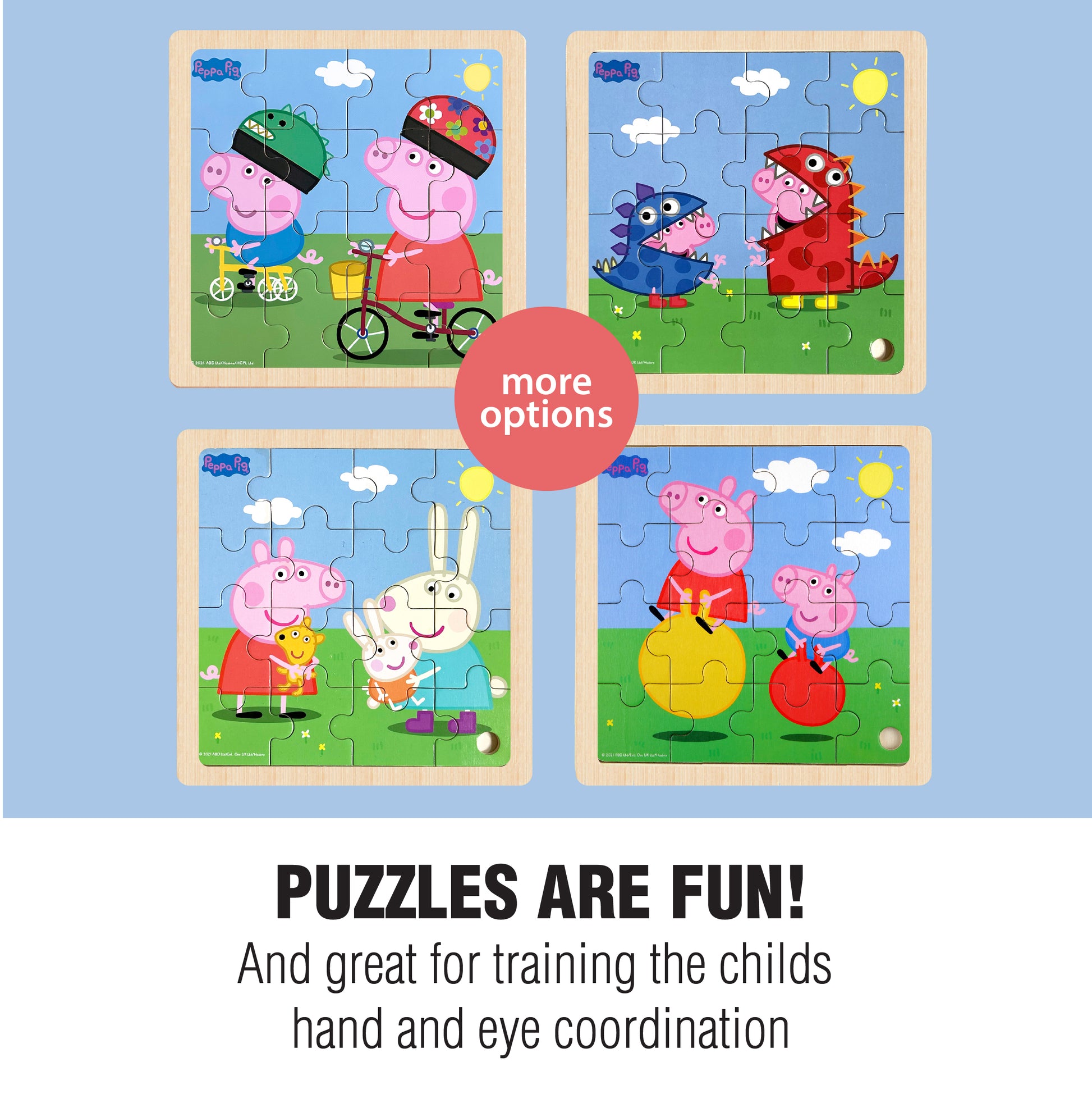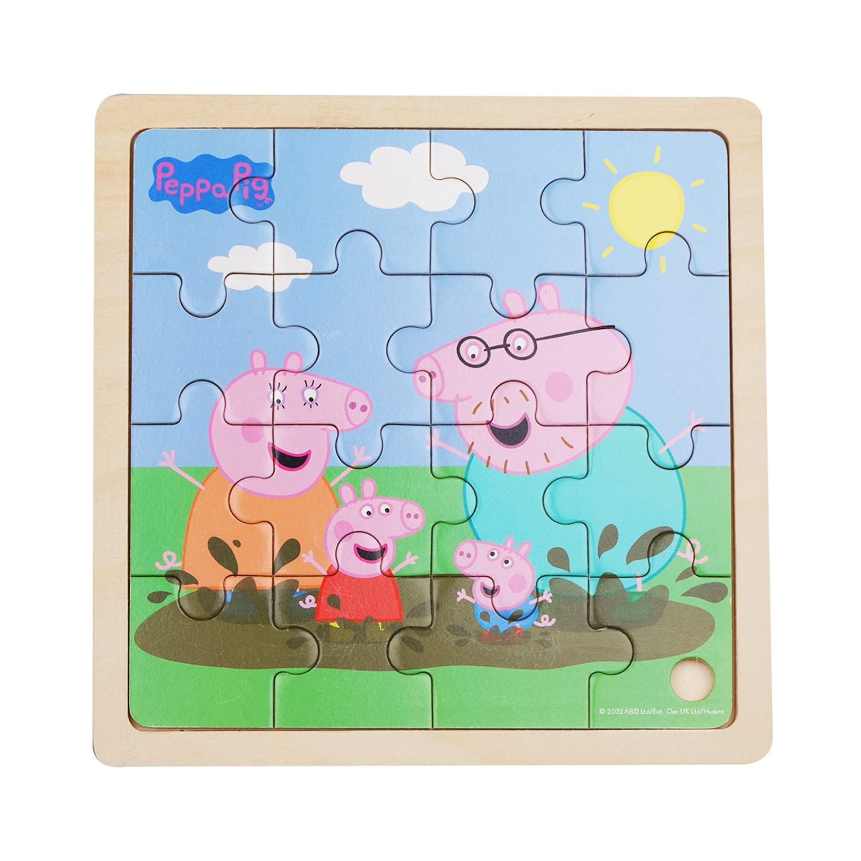 Cozy robust wooden puzzle in frame with a cute motif of Peppa Pig and her family jumping in mud
