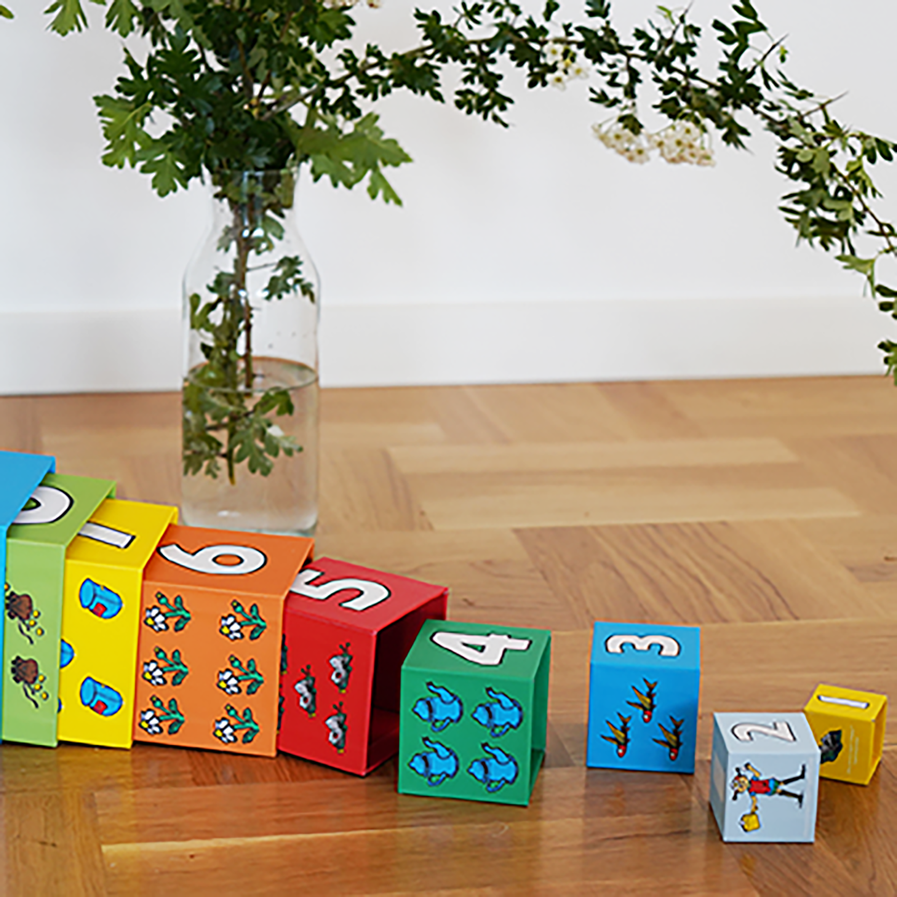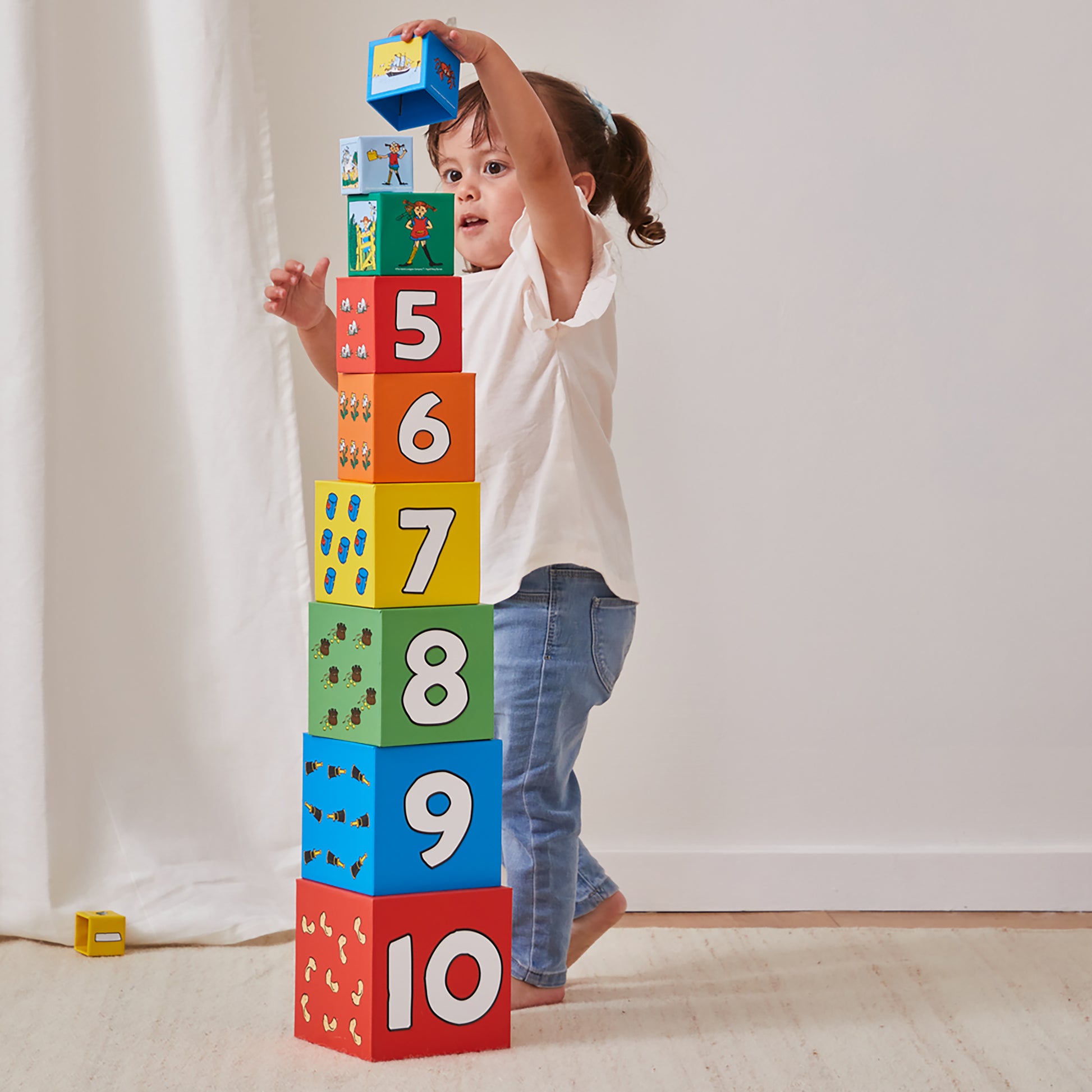 This very colorful stacking set contains 10 Pippi Longstocking stacking cubes in robust cardboard. Stacking cubes challenges your child’s concentration when they have to balance til cubes in different sizes.