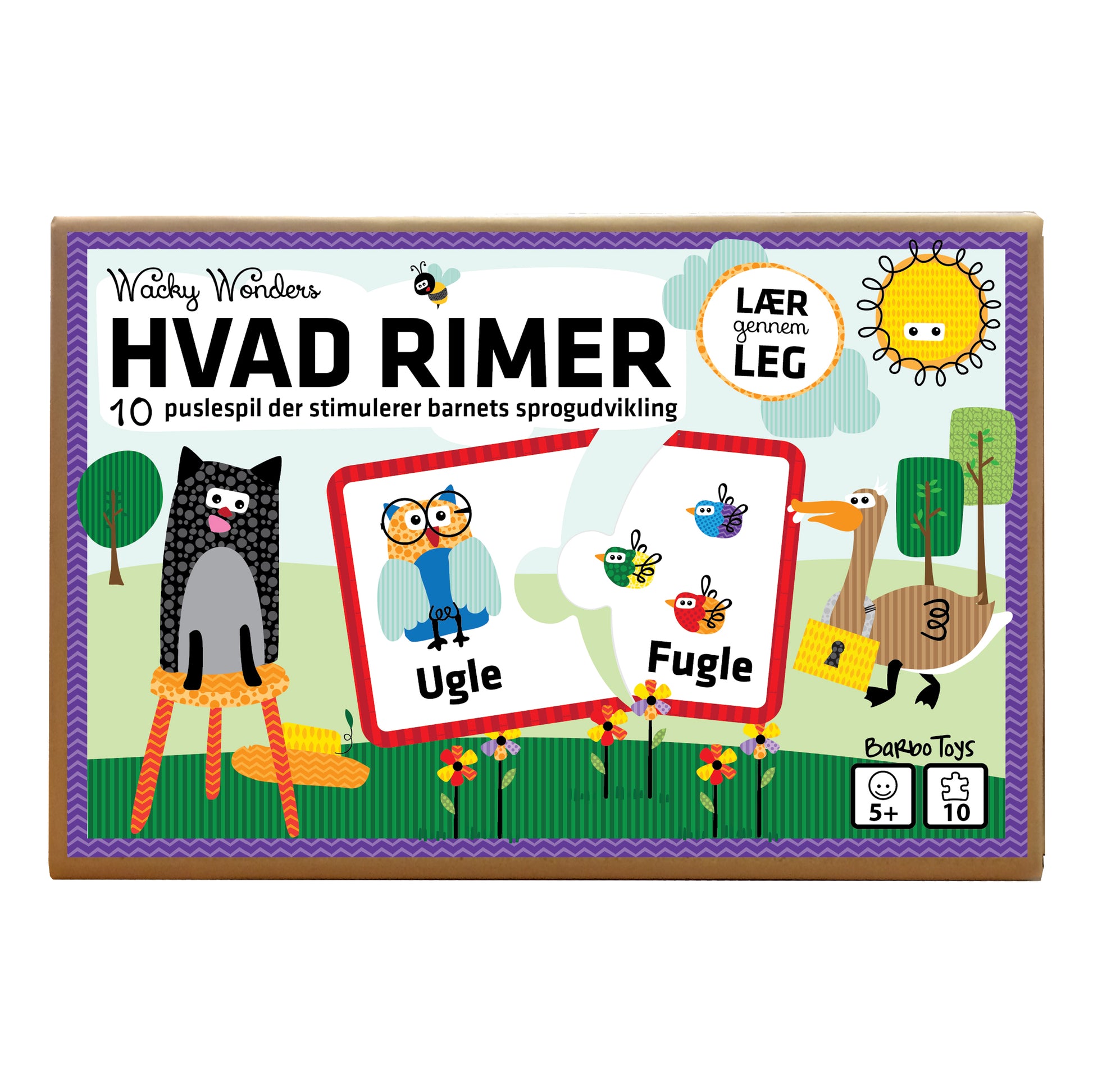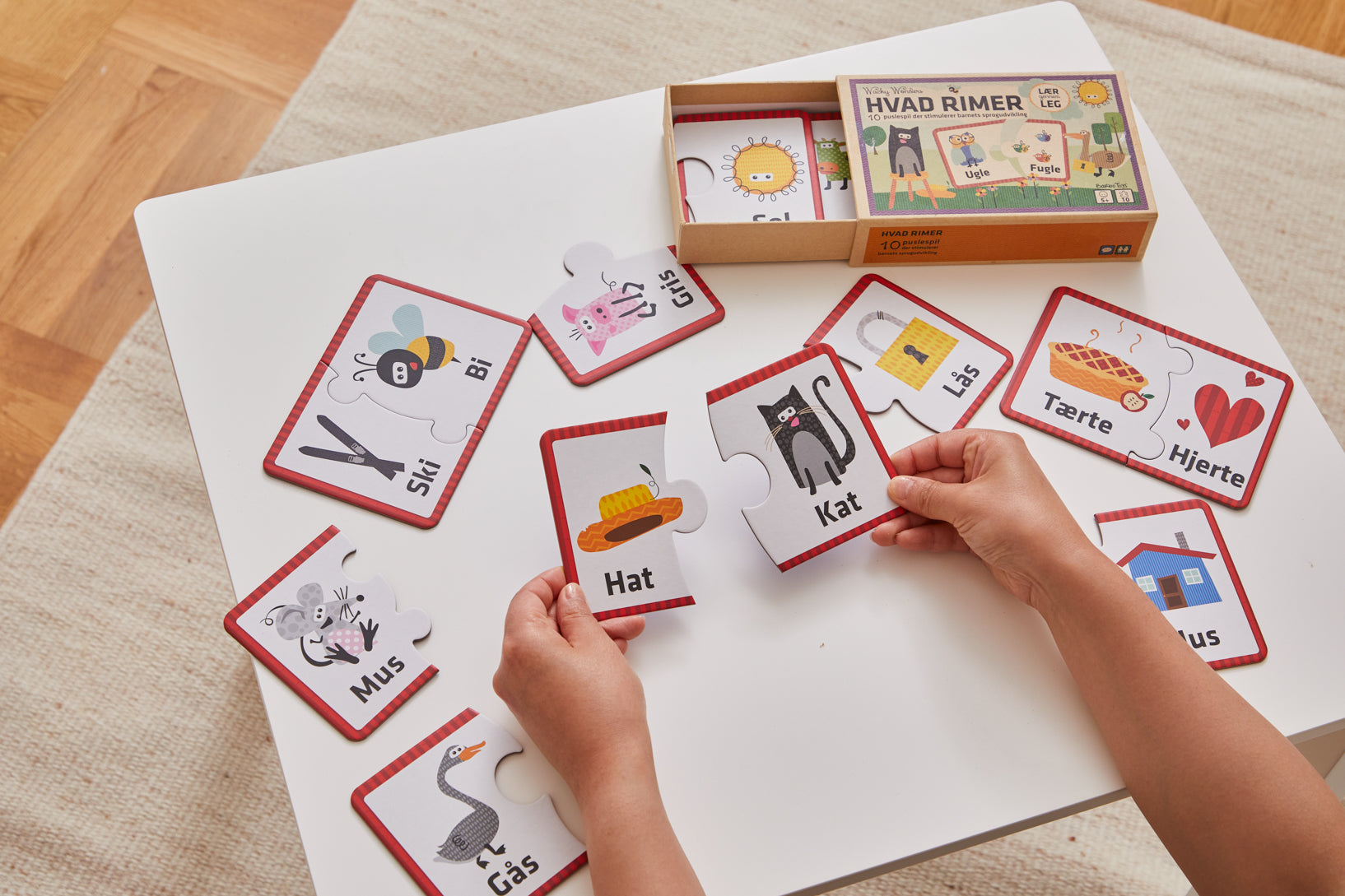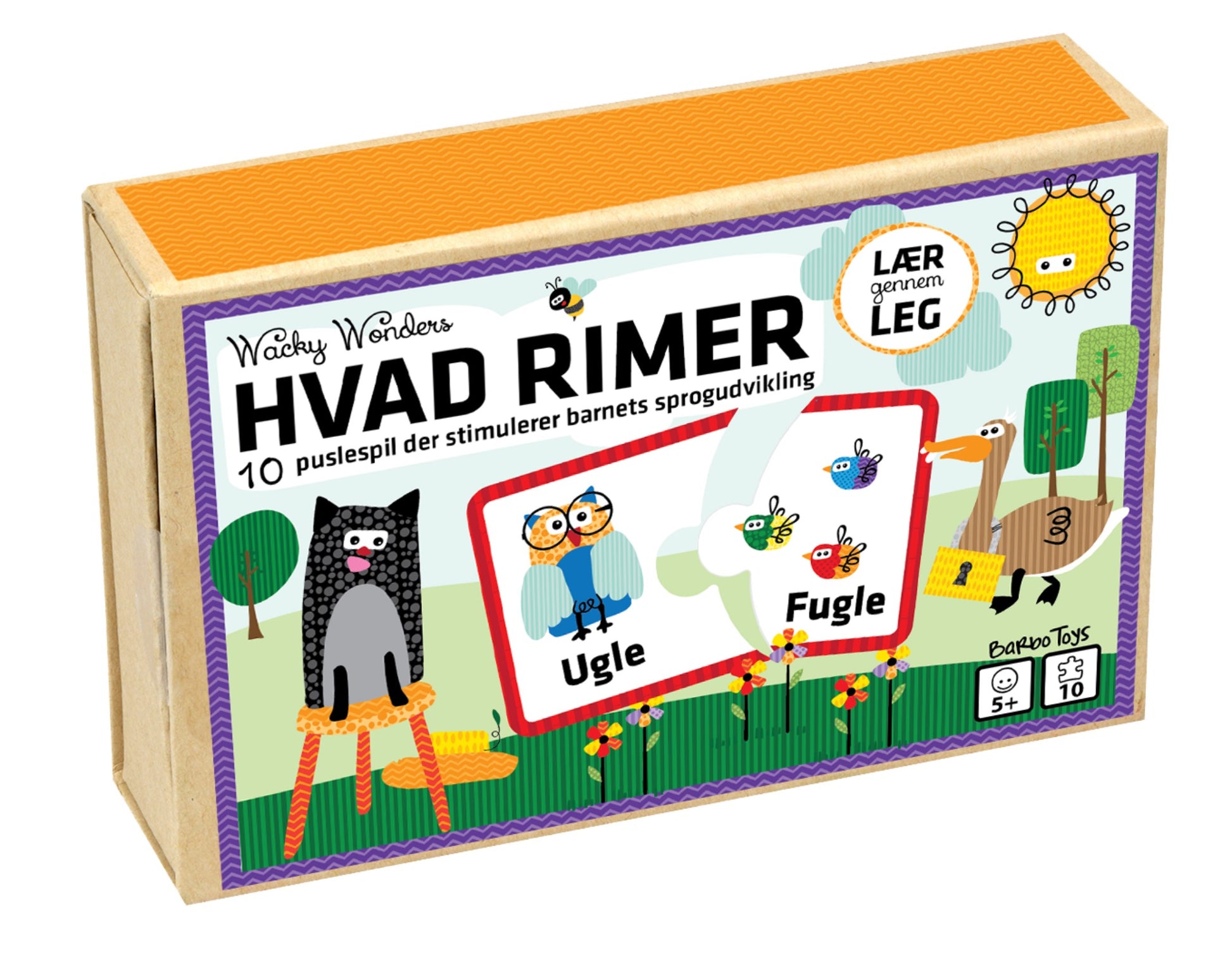 The box contains 10 puzzles. Why is it good for a child to practice rhyming? When we do activities that include rhyming through play with children, we give them the opportunity to develop their awareness of the sounds of language. When we rhyme, we present children with words that almost sound the same, most often with only a single language sound to differ.