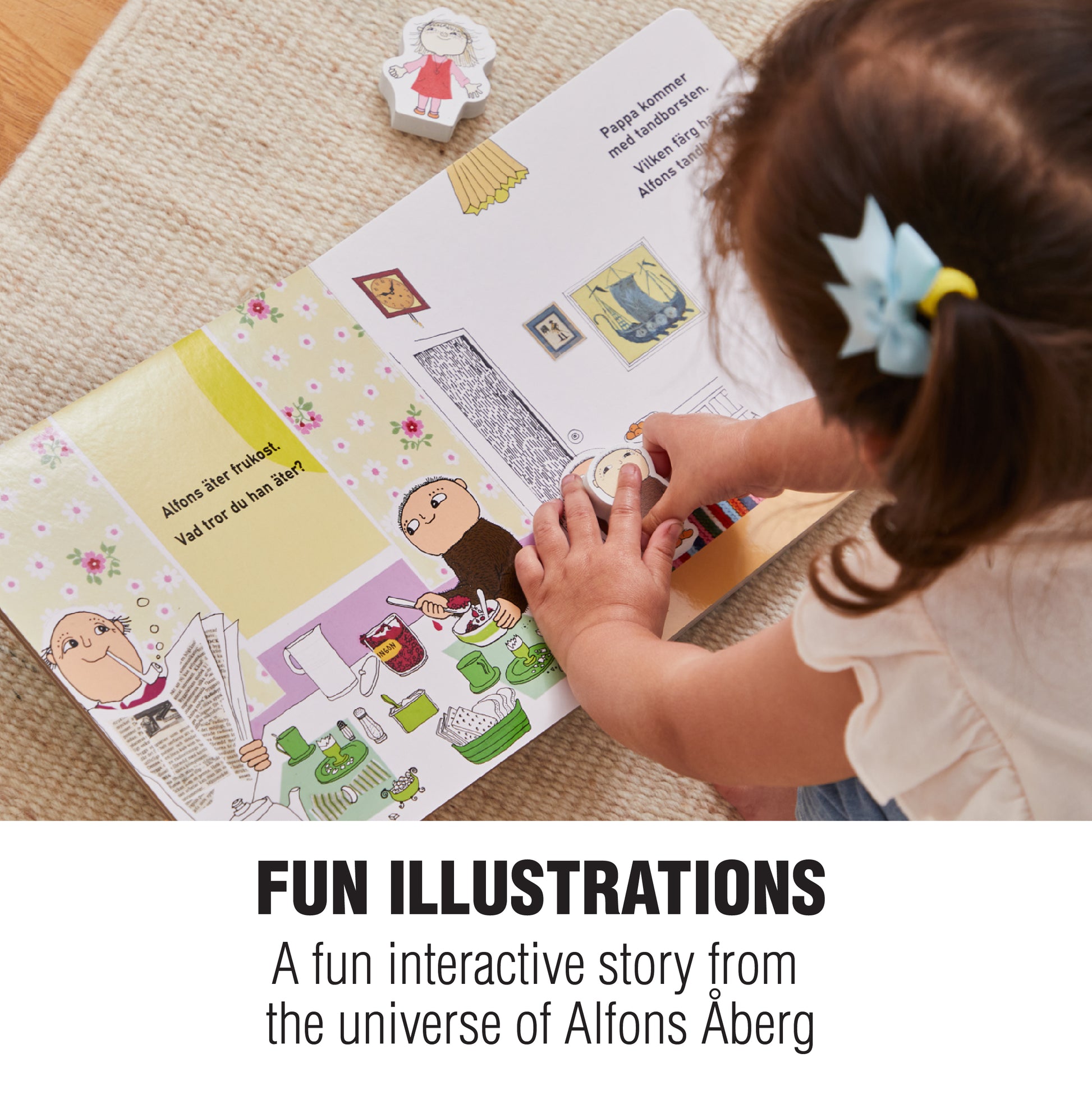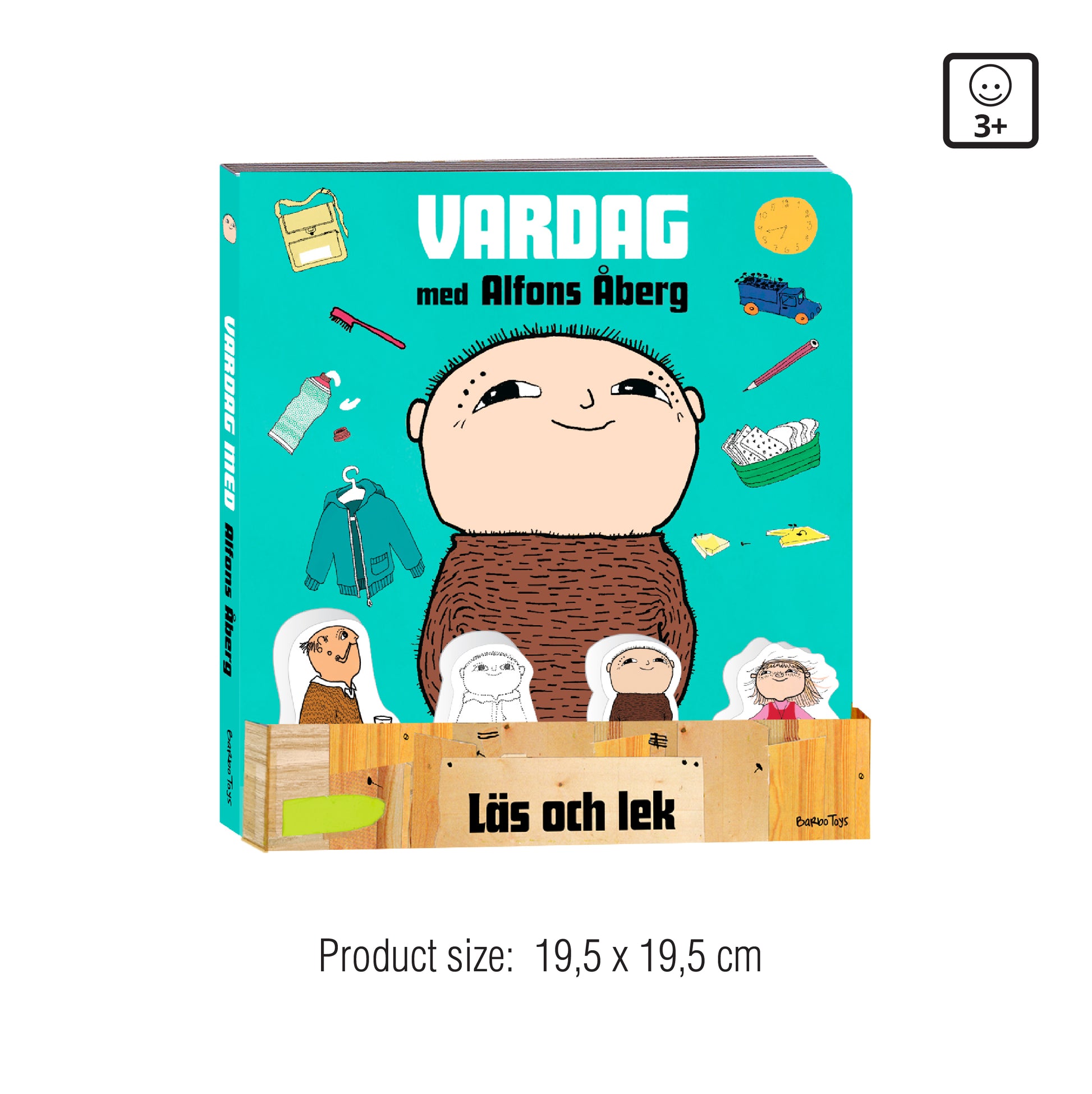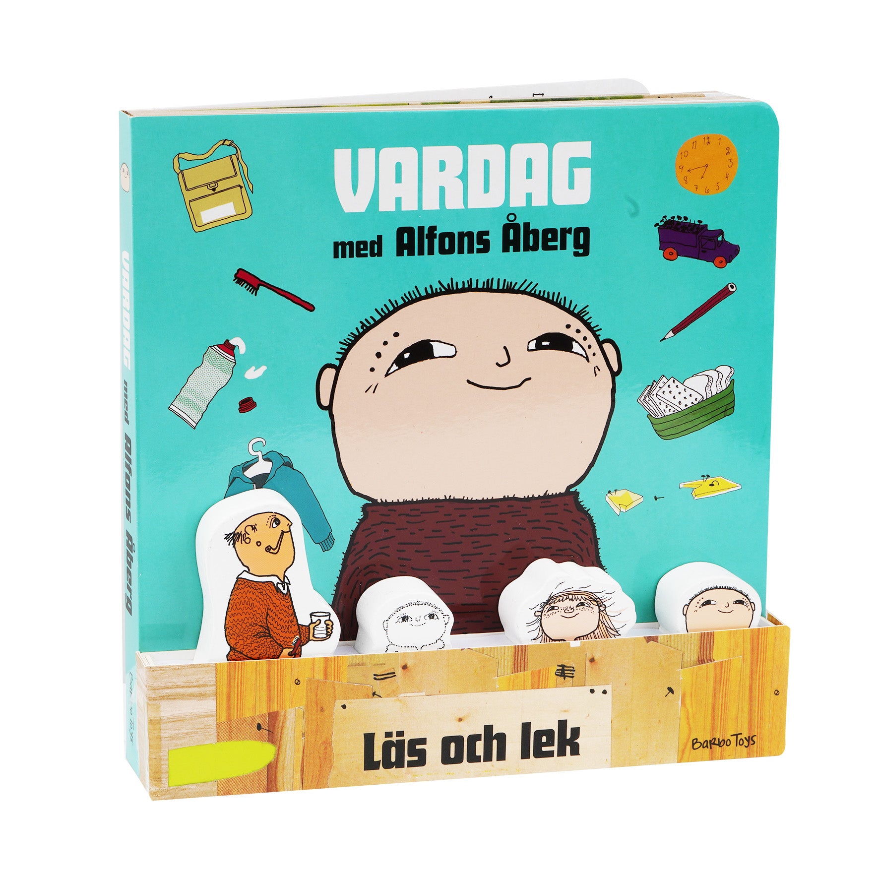Følg Alfons Åberg gennem en hyggelig dag med sin far og venner – fra han står op om morgenen, til han går i seng om aftenen. Denne smukt illustrerede bog inkluderer fire søde træfigurer, der gør historiefortællingen endnu mere interaktiv og sjov.