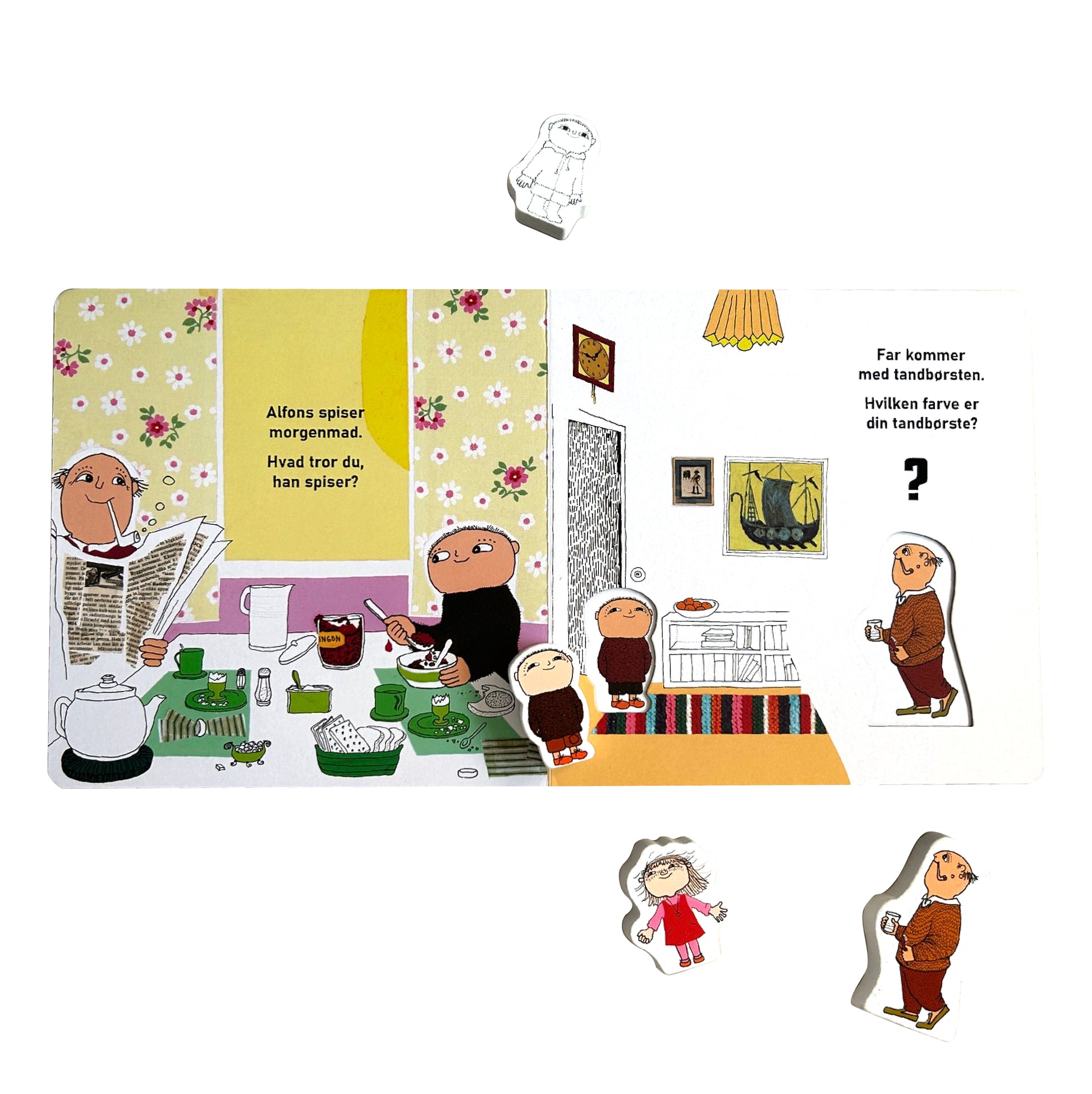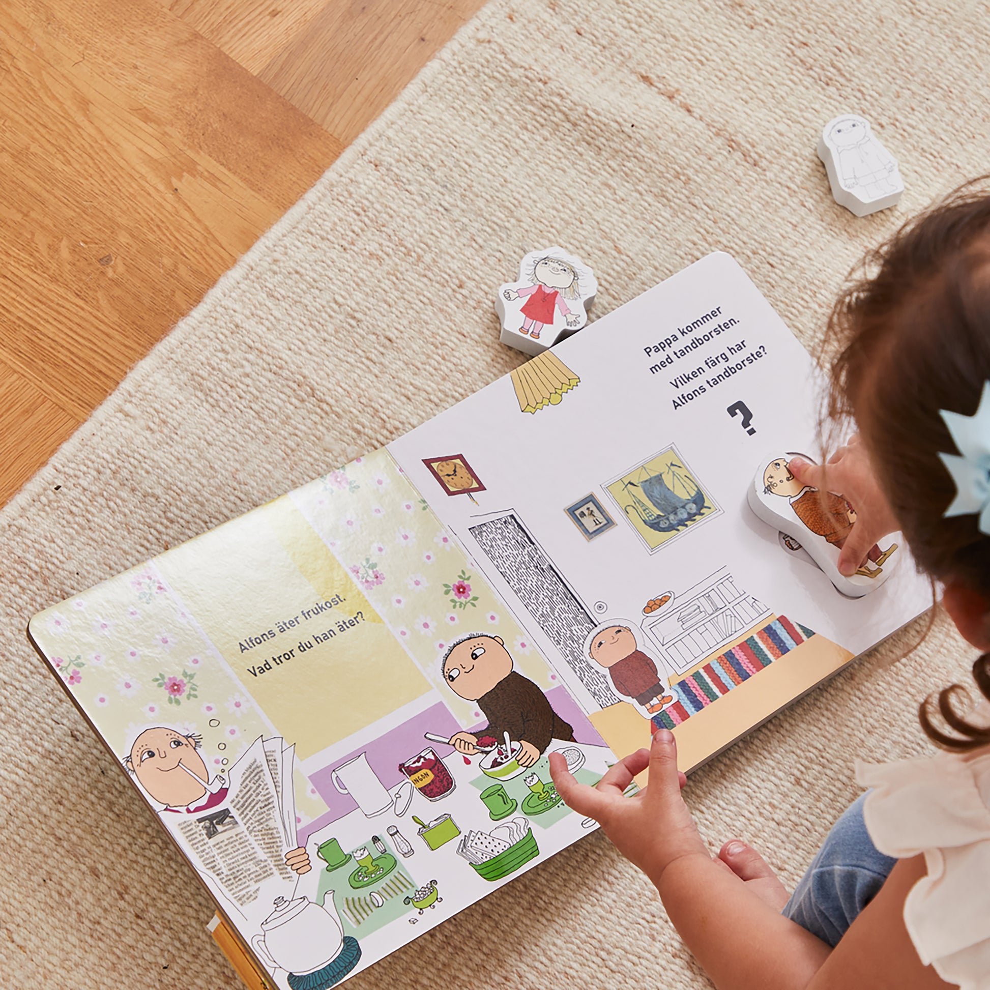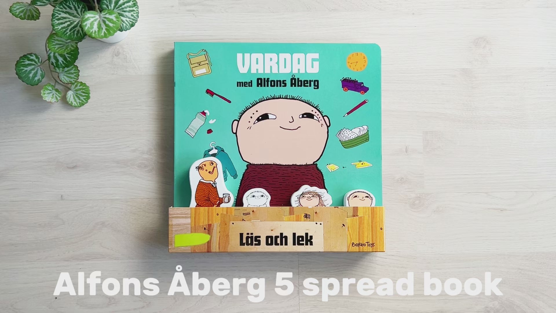 Følg Alfons Åberg gennem en hyggelig dag med sin far og venner – fra han står op om morgenen, til han går i seng om aftenen. Denne smukt illustrerede bog inkluderer fire søde træfigurer, der gør historiefortællingen endnu mere interaktiv og sjov.