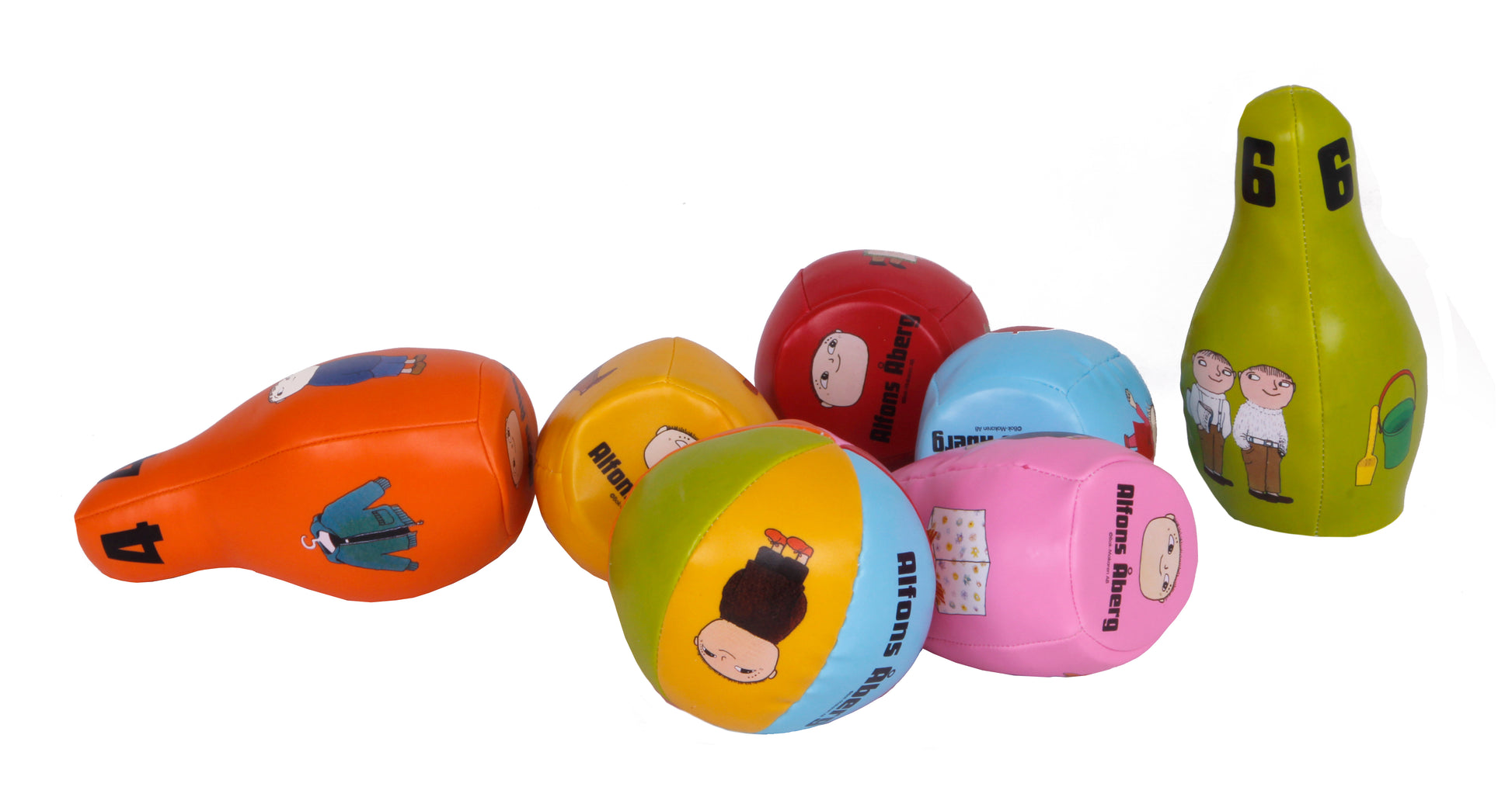 Sættet består af 6 kegler og med 2 bløde bolde – med illustrationer af Alfons Åberg og hans venner . Både kegler og bolde er holdt i klare og friske farver.