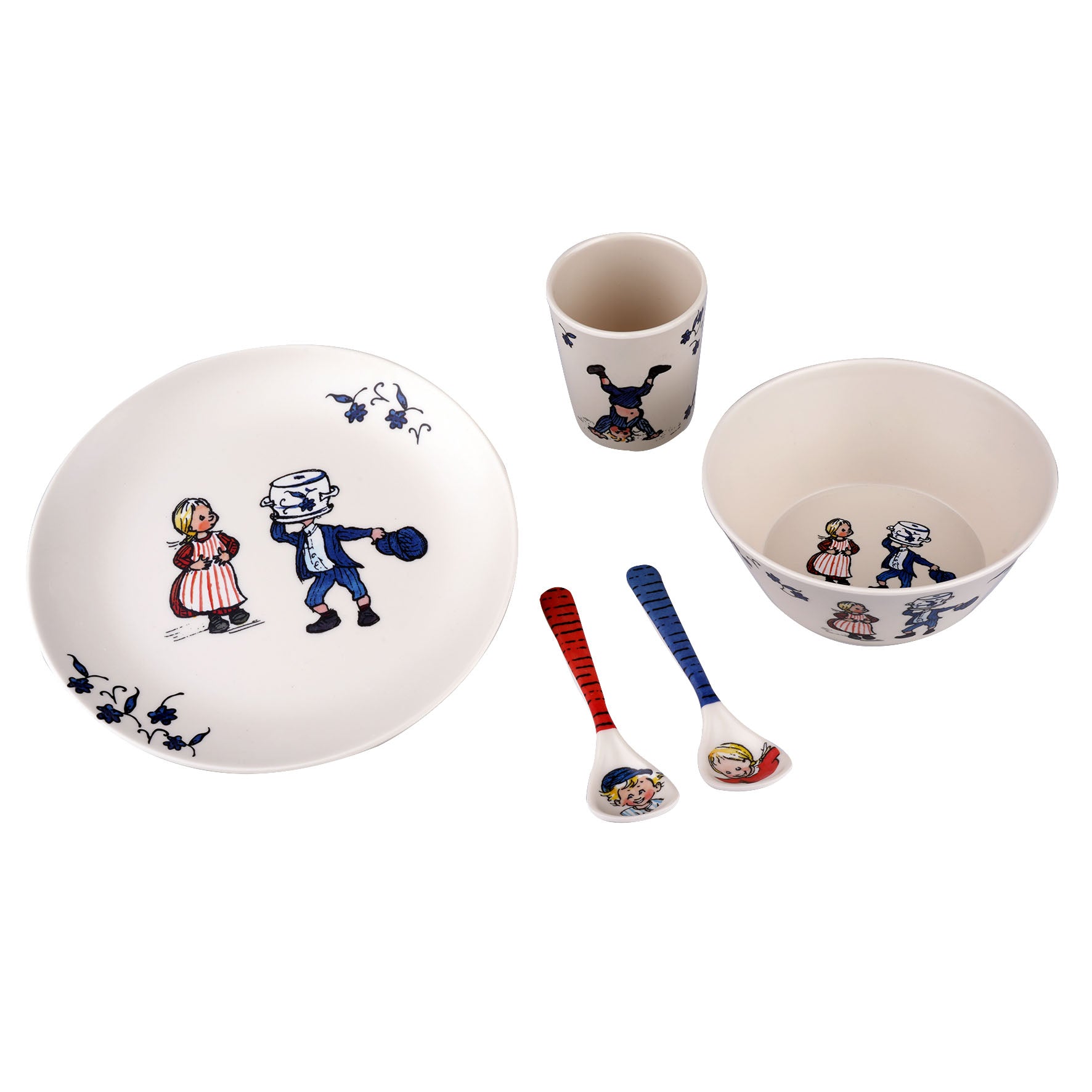Sættet indeholder en kop, en tallerken, en skål og to skeer. Det er BPA-frit, tåler opvaskemaskine, men er ikke egnet til mikrobølgeovn.