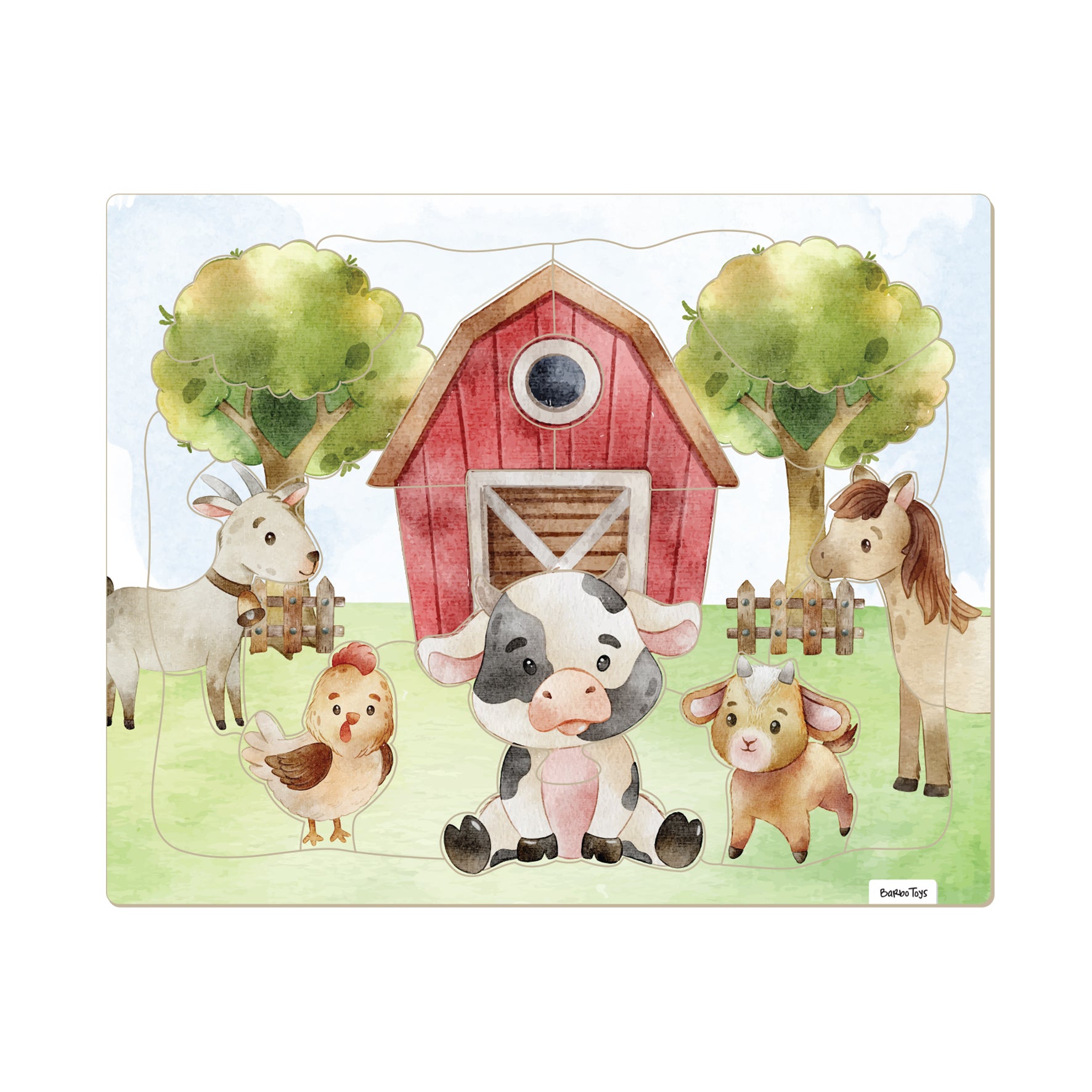 Træd ind i et idyllisk bondegårdsmiljø med dette smukt illustrerede pap-puslespil med ramme. Med søde bondegårdsdyr som en ko, ged, hest og høne bringer dette puslespil livet på landet til live på en varm og indbydende måde.