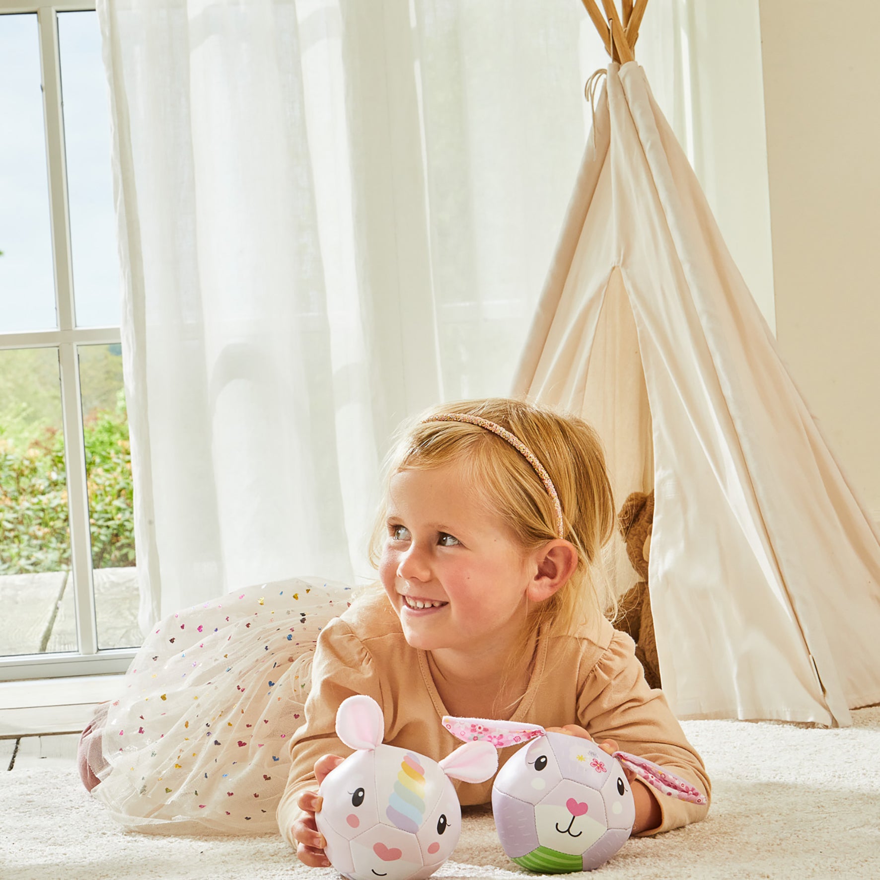 Med et charmerende enhjørninge-motiv vækker bolden fantasien og inspirerer til bevægelse både inde og ude. Den bløde overflade gør den sikker at lege med – selv for de mindste børn.