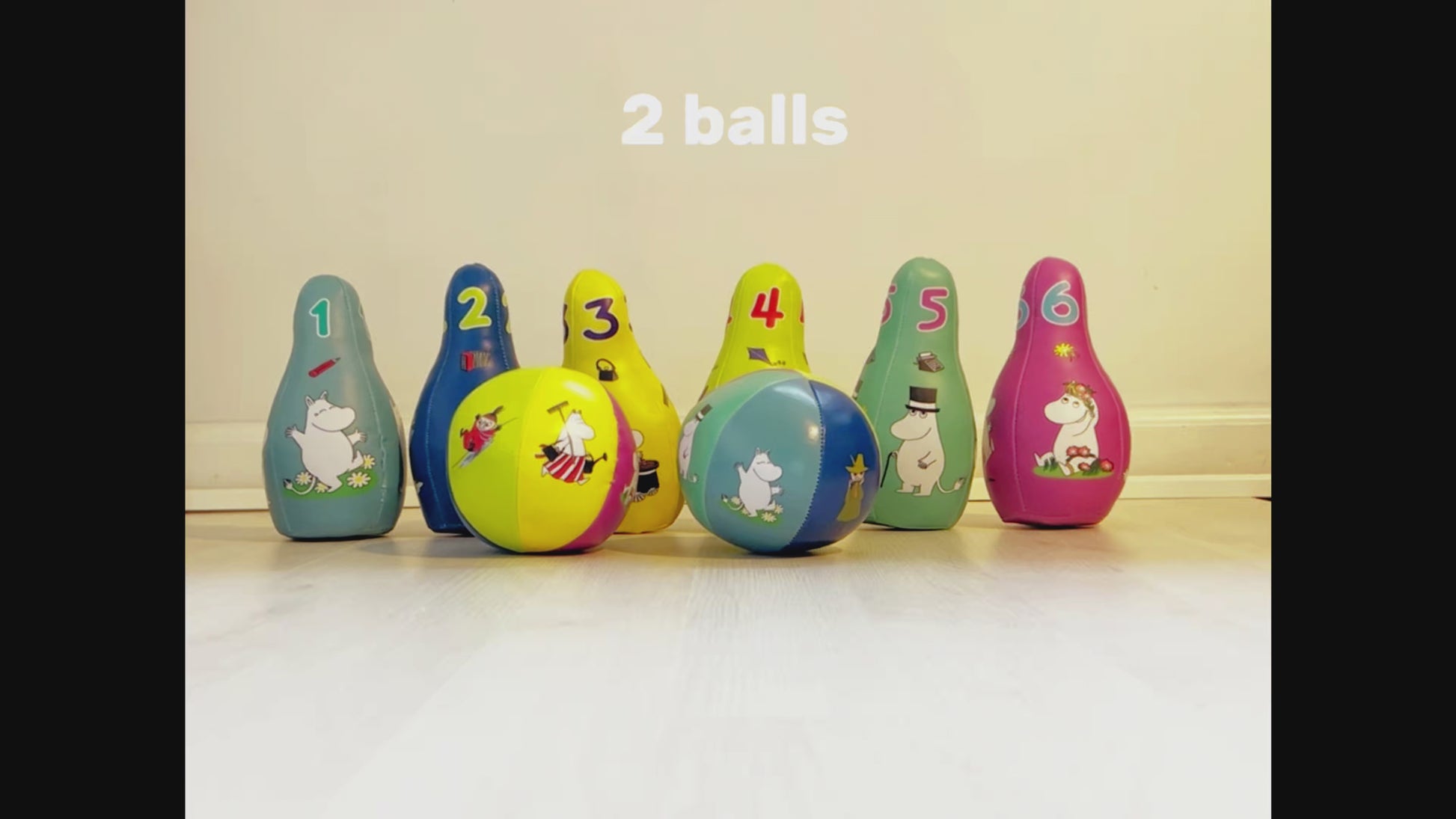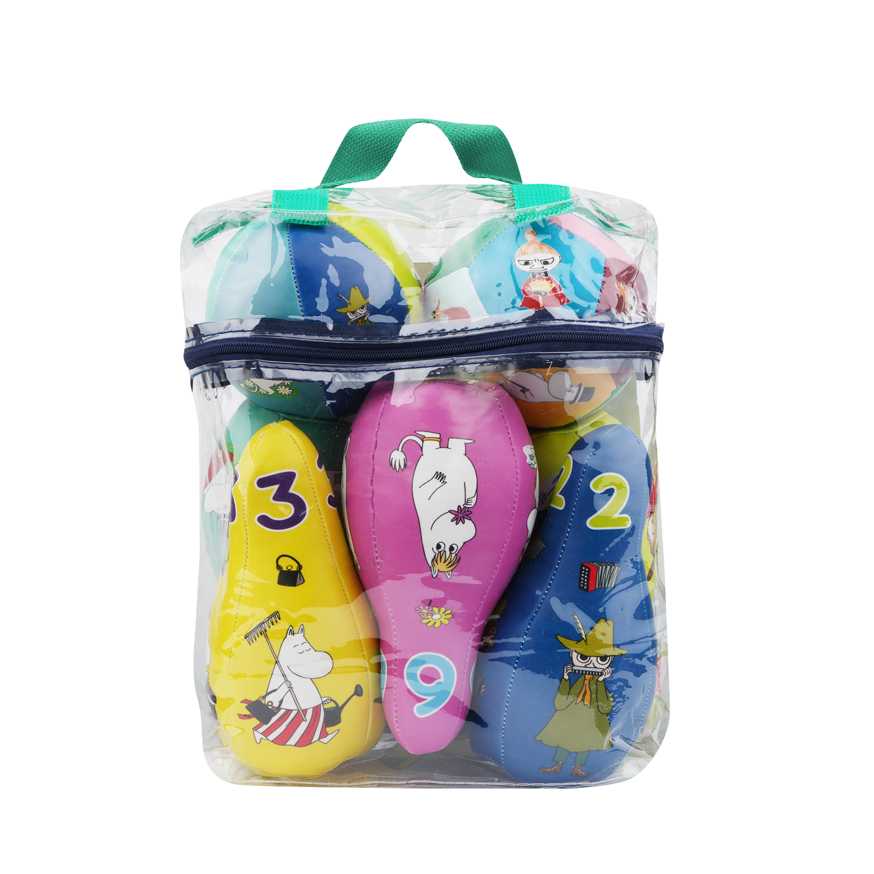 Dette farverige og bløde Mumitrolde bowlingsæt er sjovt at røre ved og lege med for selv de helt mindste. Det fine sæt har bløde bolde og bløde kegler, som gør det til et perfekte indendørs bowlingspil. Bowlingsættet fås i en praktisk opbevaringspose med hank så det er nemt at transportere. Alle dele er dekoreret med søde illustrationer af karakterer fra Mumi universet. Velegnet til børn fra 12 måneder.