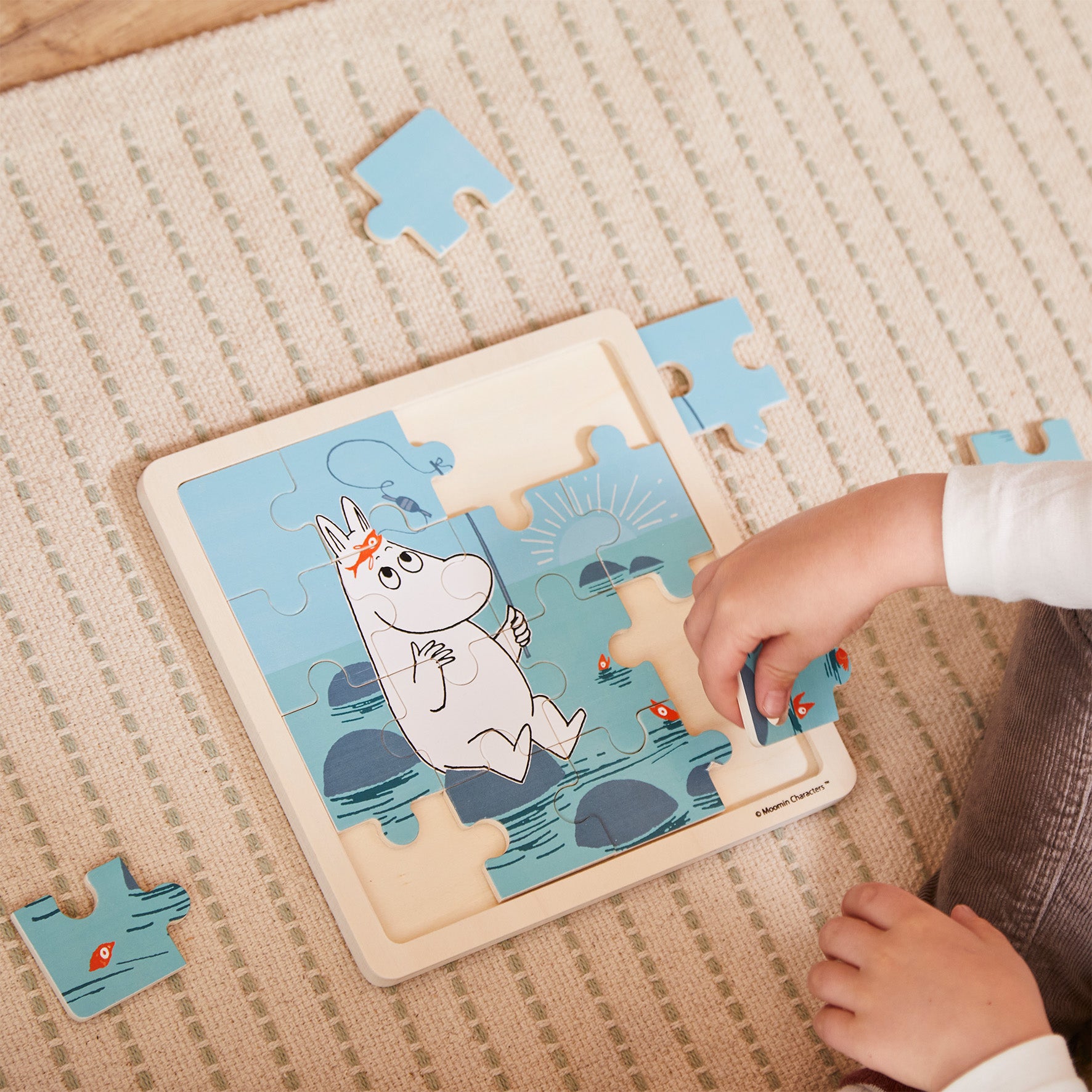 Hyggeligt robust træpuslespil i en ramme med et sødt motiv af Mumi på fisketur