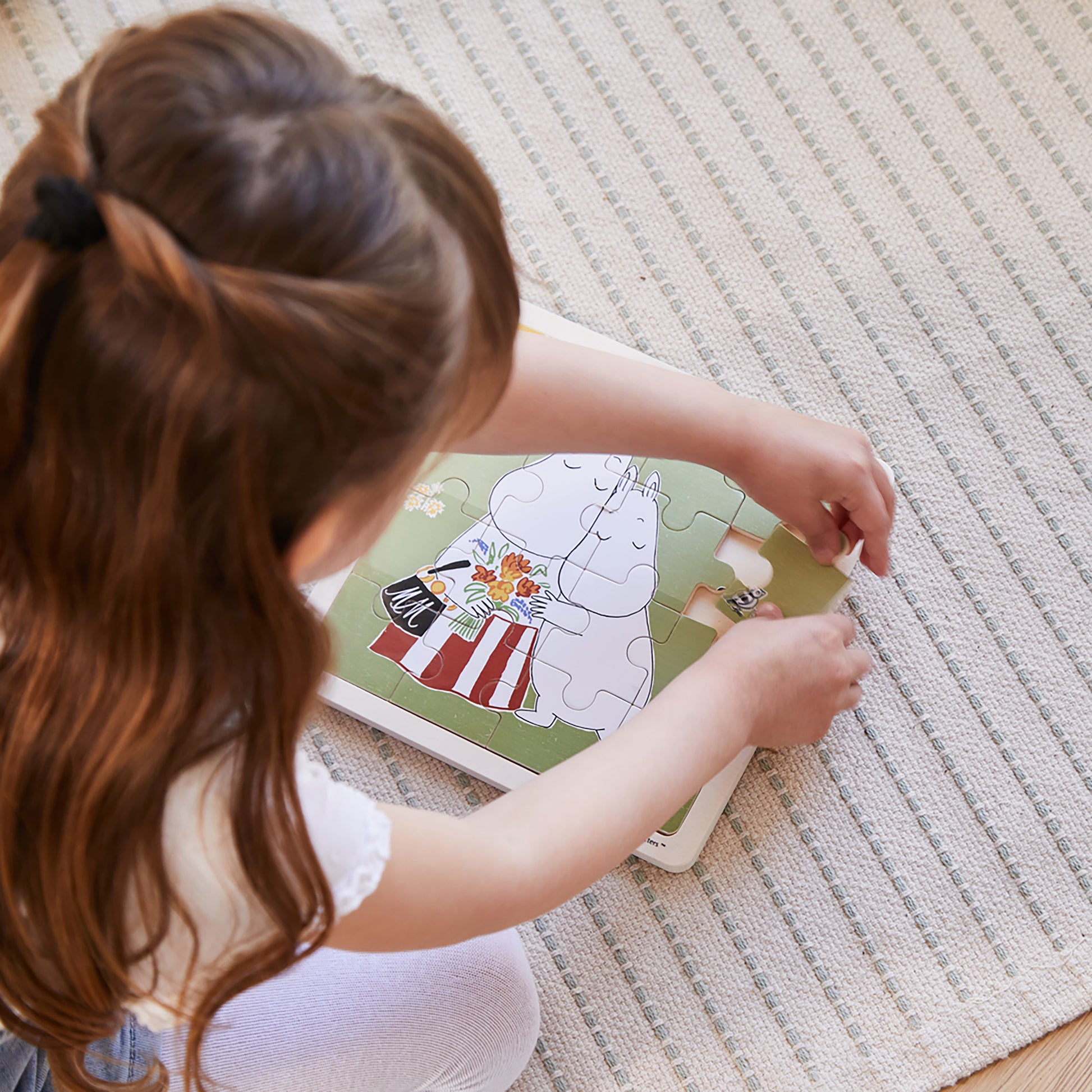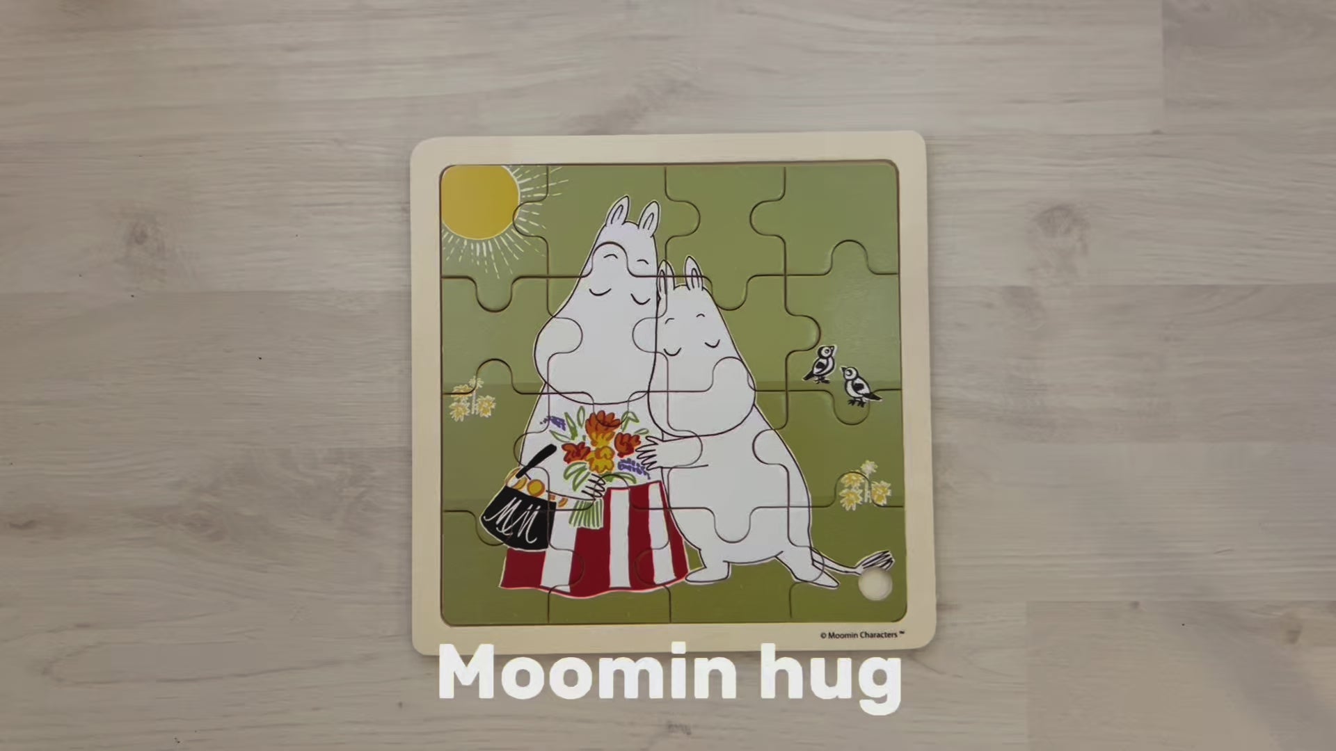 Hyggeligt robust træpuslespil i en ramme med et sødt motiv af Moomin og Muminmamma-krammer.