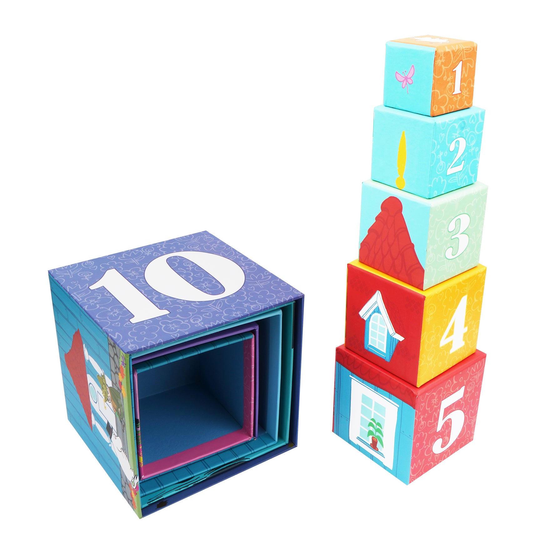 Sættet består af 10 smukt illustrerede kasser, hvor hver side viser livlige scener fra Mumi-universet, tal, former og farver. Dette sæt hjælper børn fra 3 år og opefter med at styrke deres motoriske færdigheder, rumlige forståelse og tidlige tælleevner, mens de stabler, sorterer og udforsker.