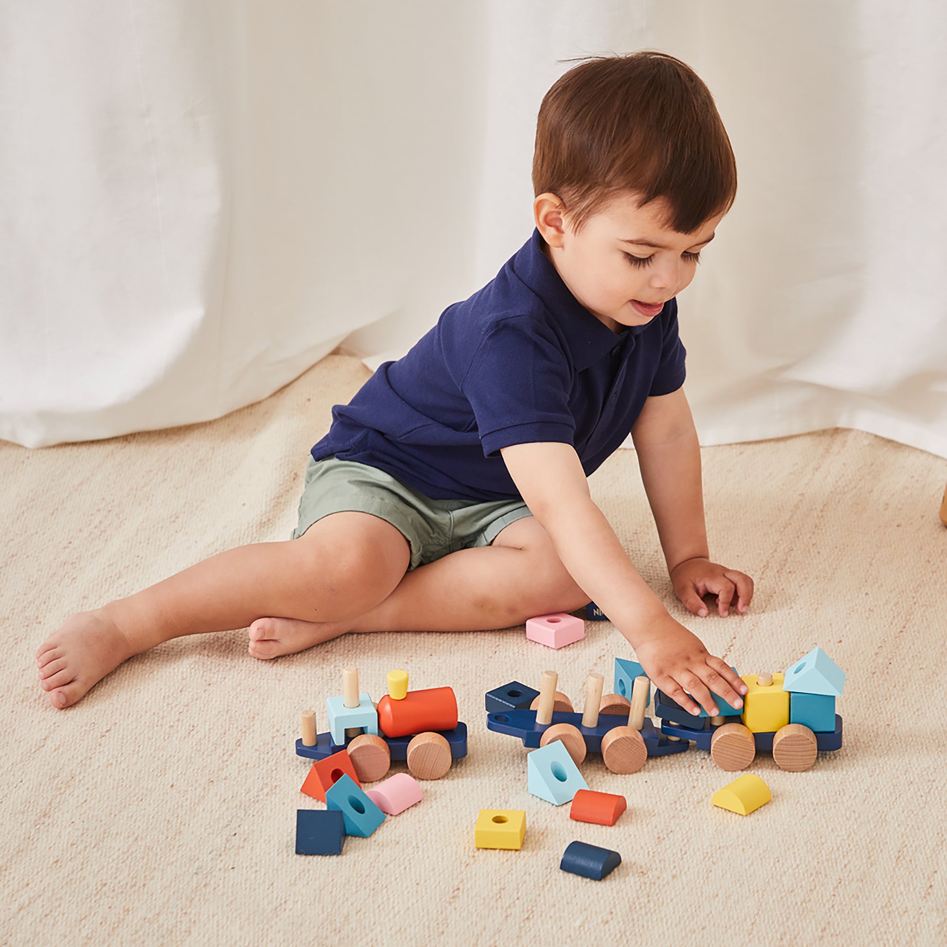 At lege med klodser er interessant for både helt små og lidt større børn, som kan bruge timer på at sætte dem sammen på forskellige måder. Klodserne vil udvikle barnets hånd-øje koordination, finmotorik og fantasi, når de er stablet alene eller i det lille tog.