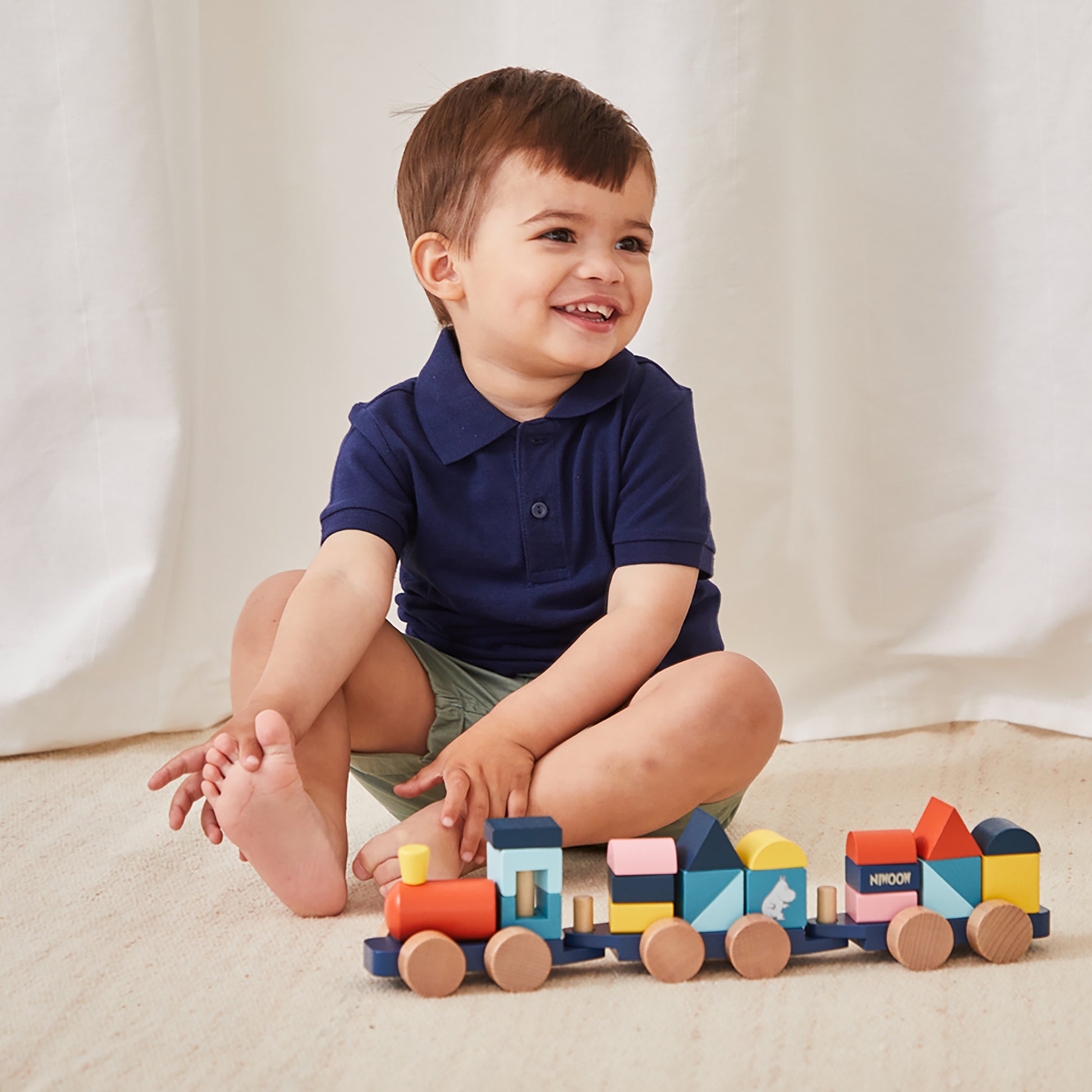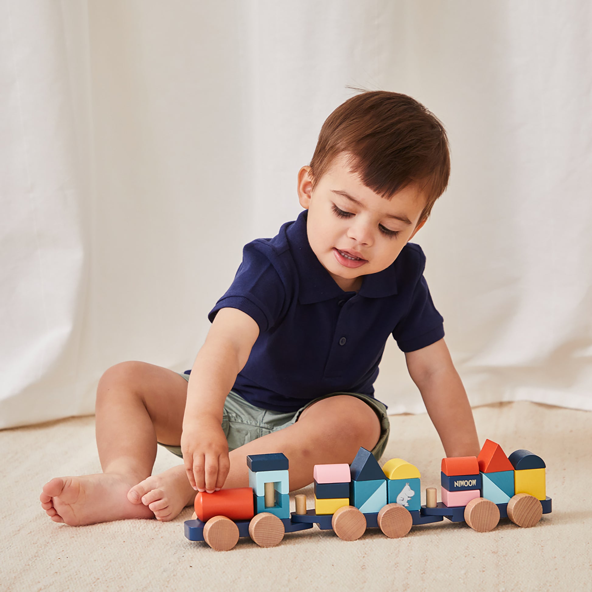 Super sødt Moomin trætog med stabelklodser på togvognene som har forskellige former og er sat sammen til et smukt tog.