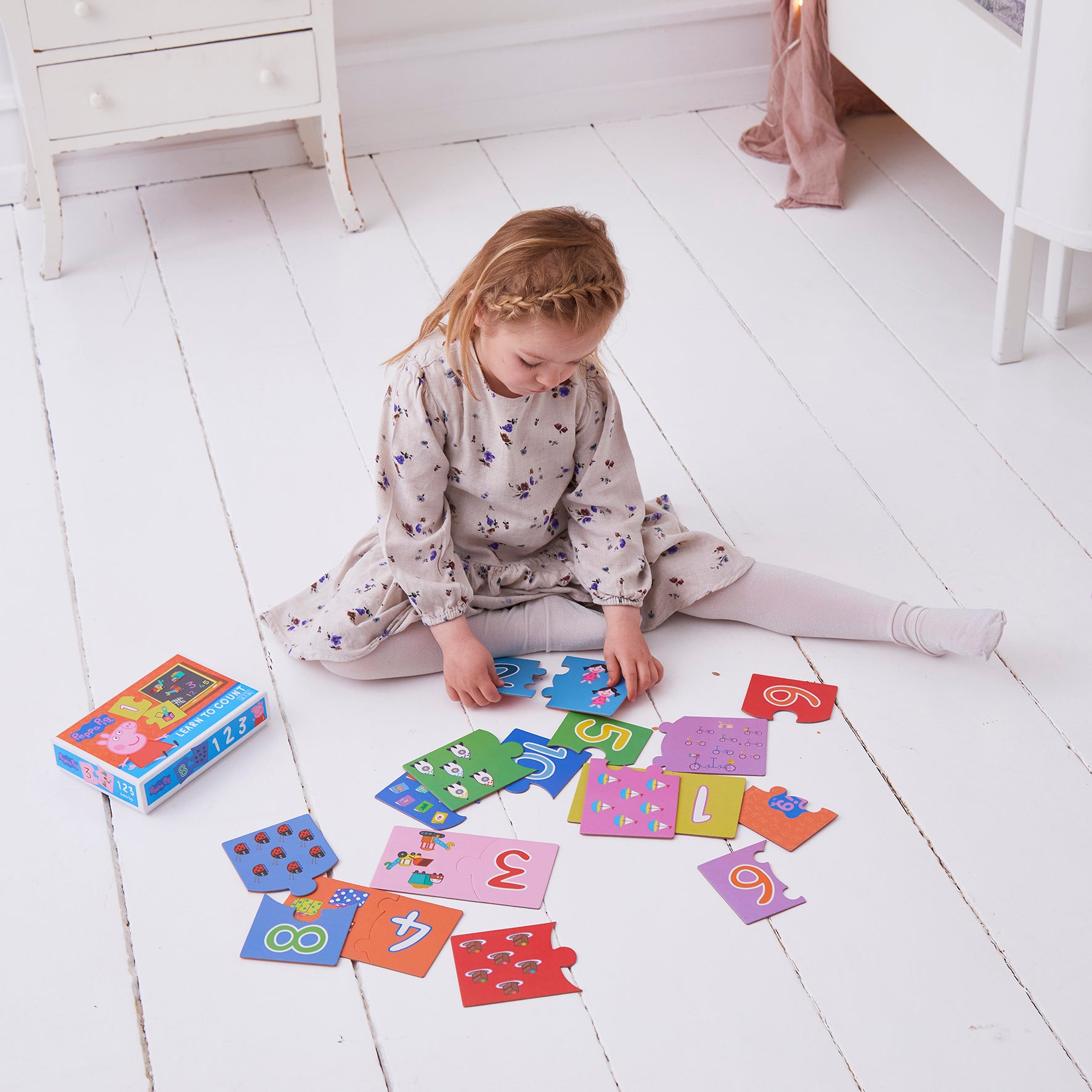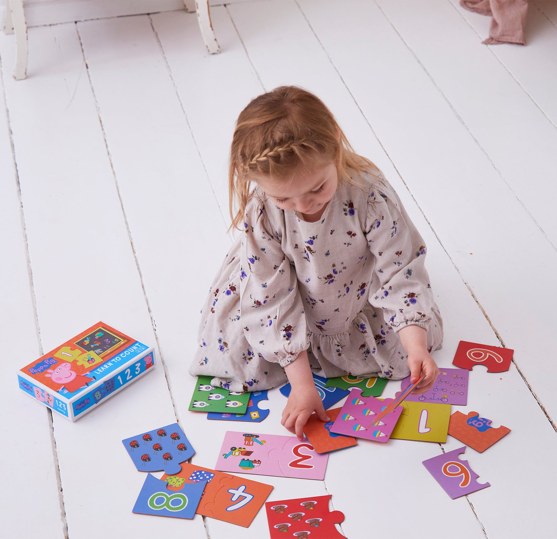 Med disse søde puslespil med Gurli Gris skal børnene sammensætte tal med billeder. Spillet indeholder 10 mini puslespil som kun har to brikker. Her handler det om, at børnene skal matche tallene med figurerne. Hvis barnet for eksempel tager puslespillet med tallet 6, så vil man på den venstre brik tallet 6. Herefter skal barnet kigge på brikkerne med de forskellige illustrationer og tælle sig frem til tallet 6. Sådan forsætter legen indtil barnet har matchet alle 10 mini puslespil.