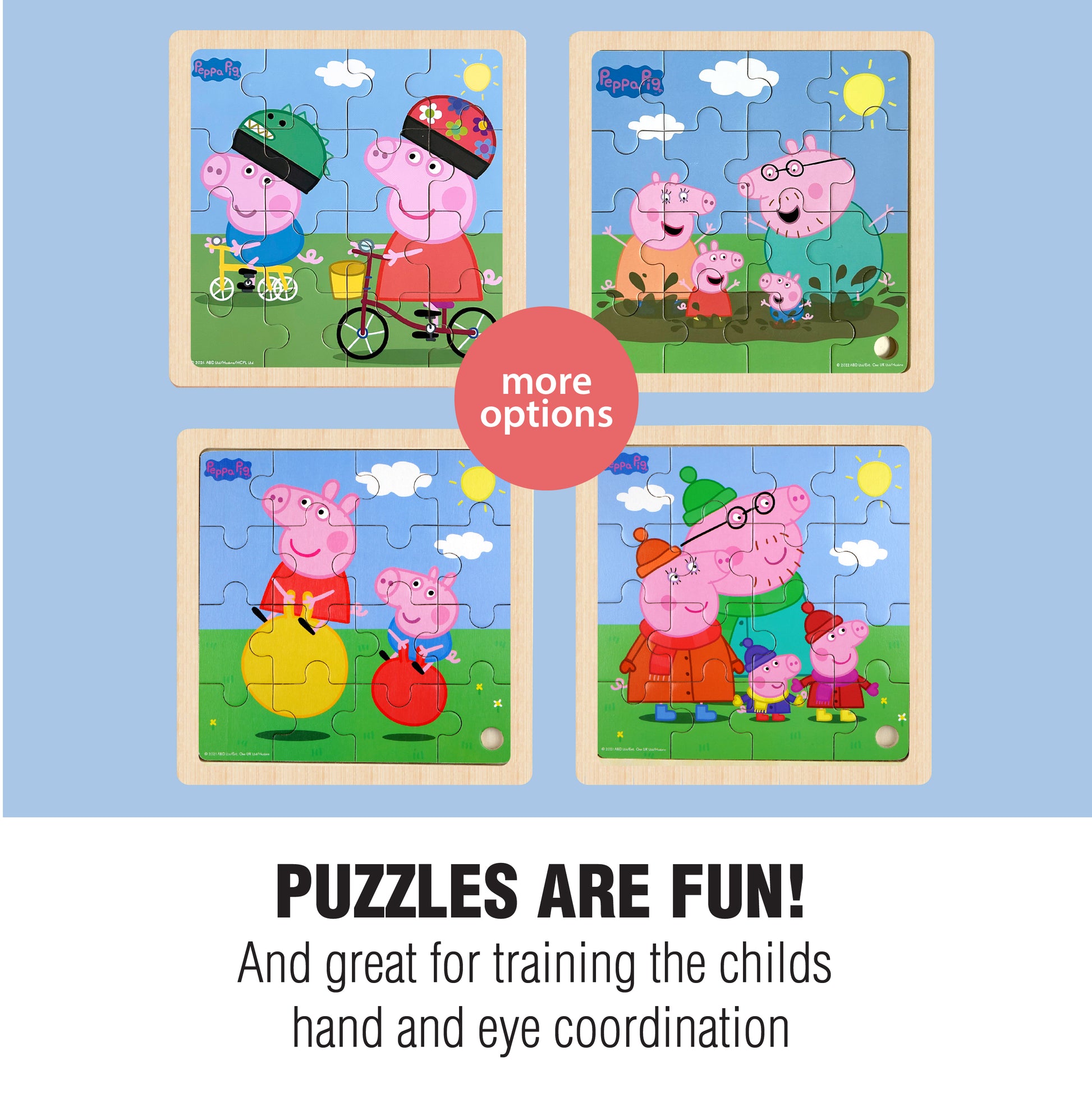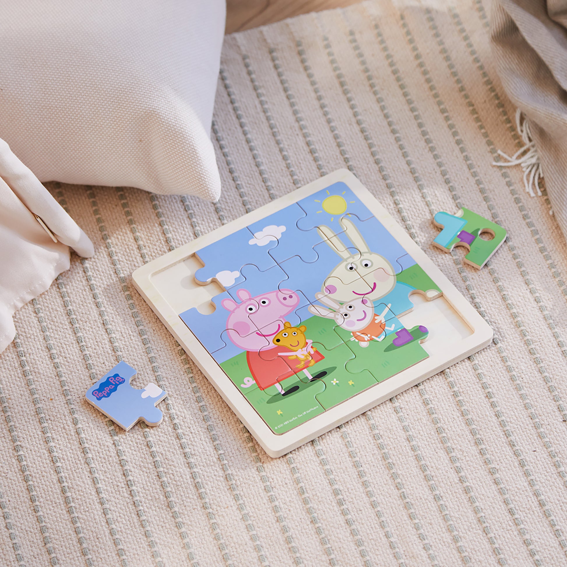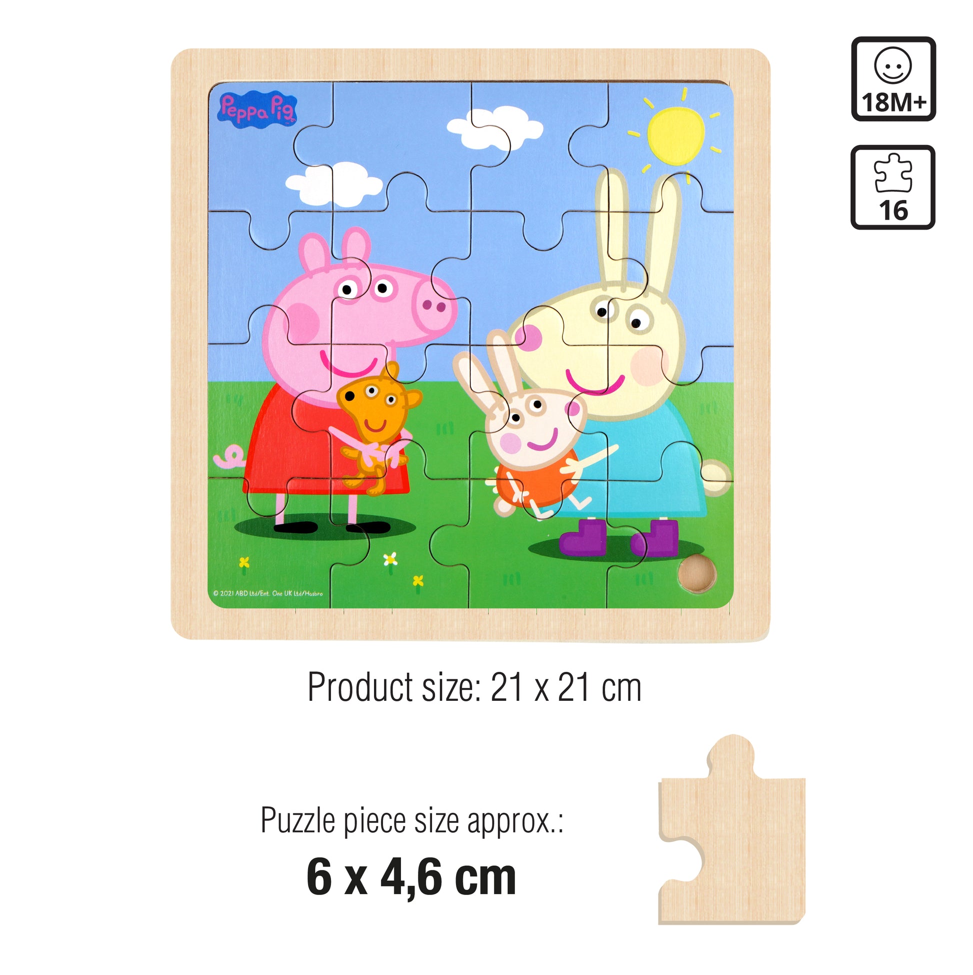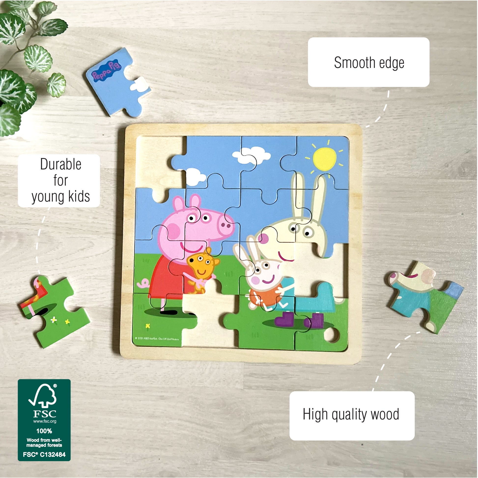 Hyggeligt robust træpuslespil i ramme med et sødt motiv af Peppa Pig og hendes veninde Rebecca. Puslespillet vil bringe mange timers leg og udvikling for de mindste. Puslespil udvikler dit barns visuelle opfattelse og finmotorik. Puslespil er en rigtig god træning og udvikling, du kan give dit barn.