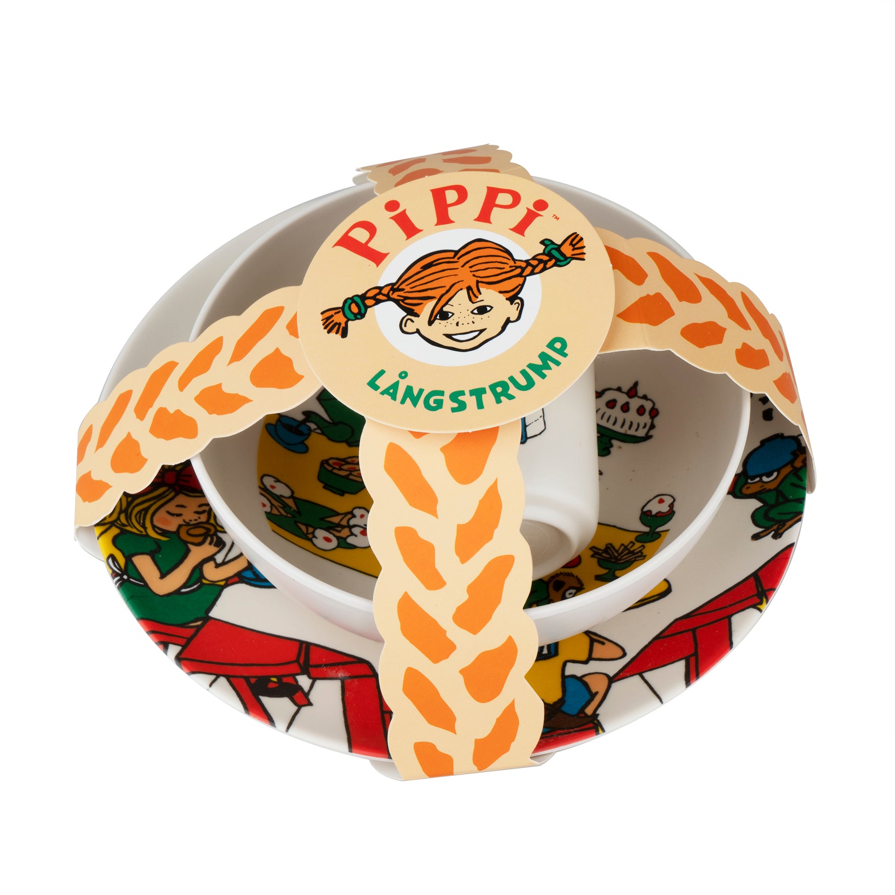 Her kommer Pippi Langstrømp’, Tul-la-hop, tul-la-hej, tul-la-hop-sa-sa. Her får du en super flot gaveæske med et sjovt spisesæt i originale farver og med flotte motiver fra Pippi Langstrømpe universet, som vil gøre ethvert måltid lidt sjovere for børnene. Spisesættet er en perfekt start til når den lille skal til at begynde at spise selv. Spisesættet er lavet af melaminharpiks (BPA-frit) som både er praktisk, slidstærkt og er helt essentielt til hverdagsbrug, picnics og meget mere. Børnene vil elske at have deres helt eget farverige spisesæt dekoreret med de velkendte og elskede karakterer fra Pippi Langstrømpe universet. En oplagt gaveide til barnedåb, navngivningsfesten, fødselsdage eller jul.