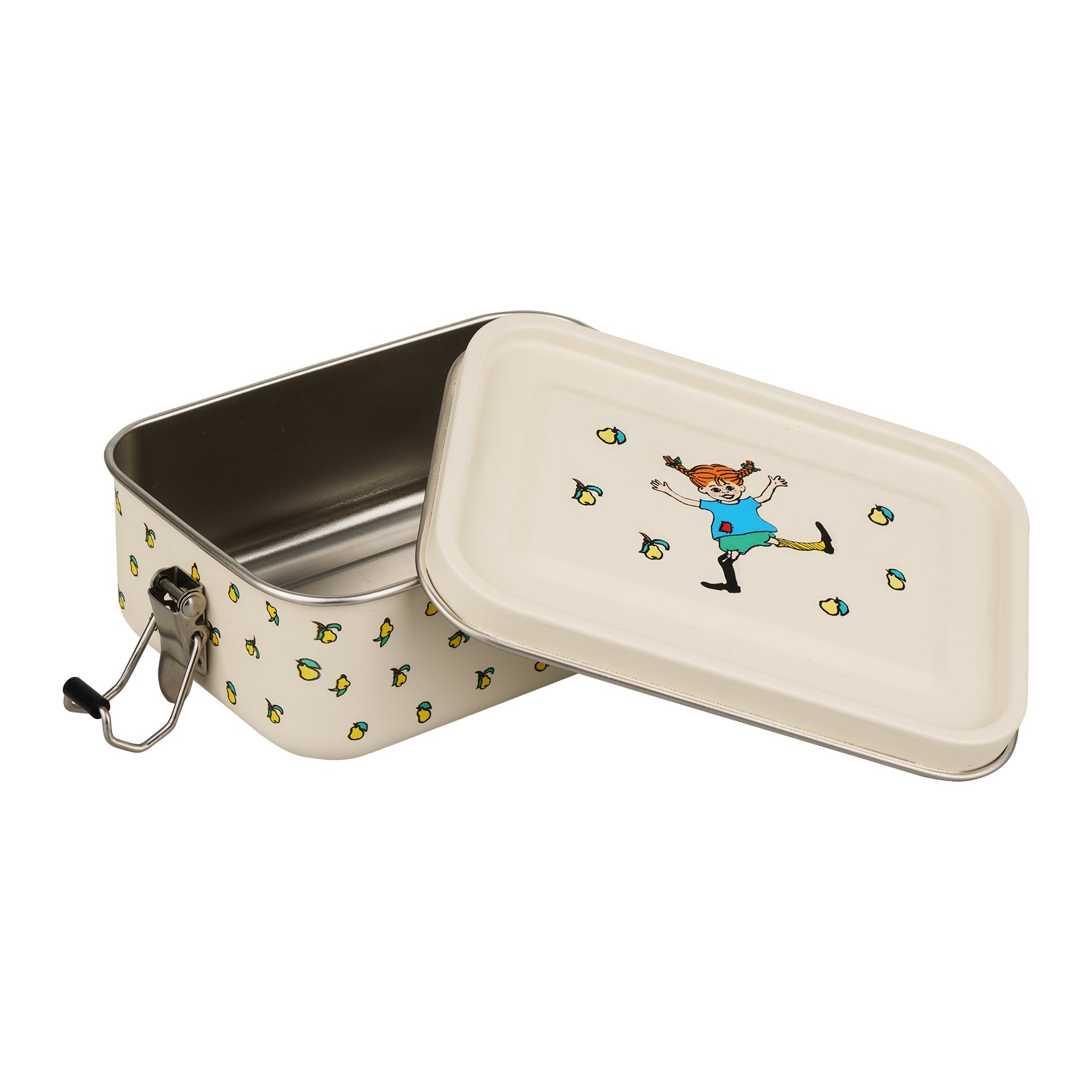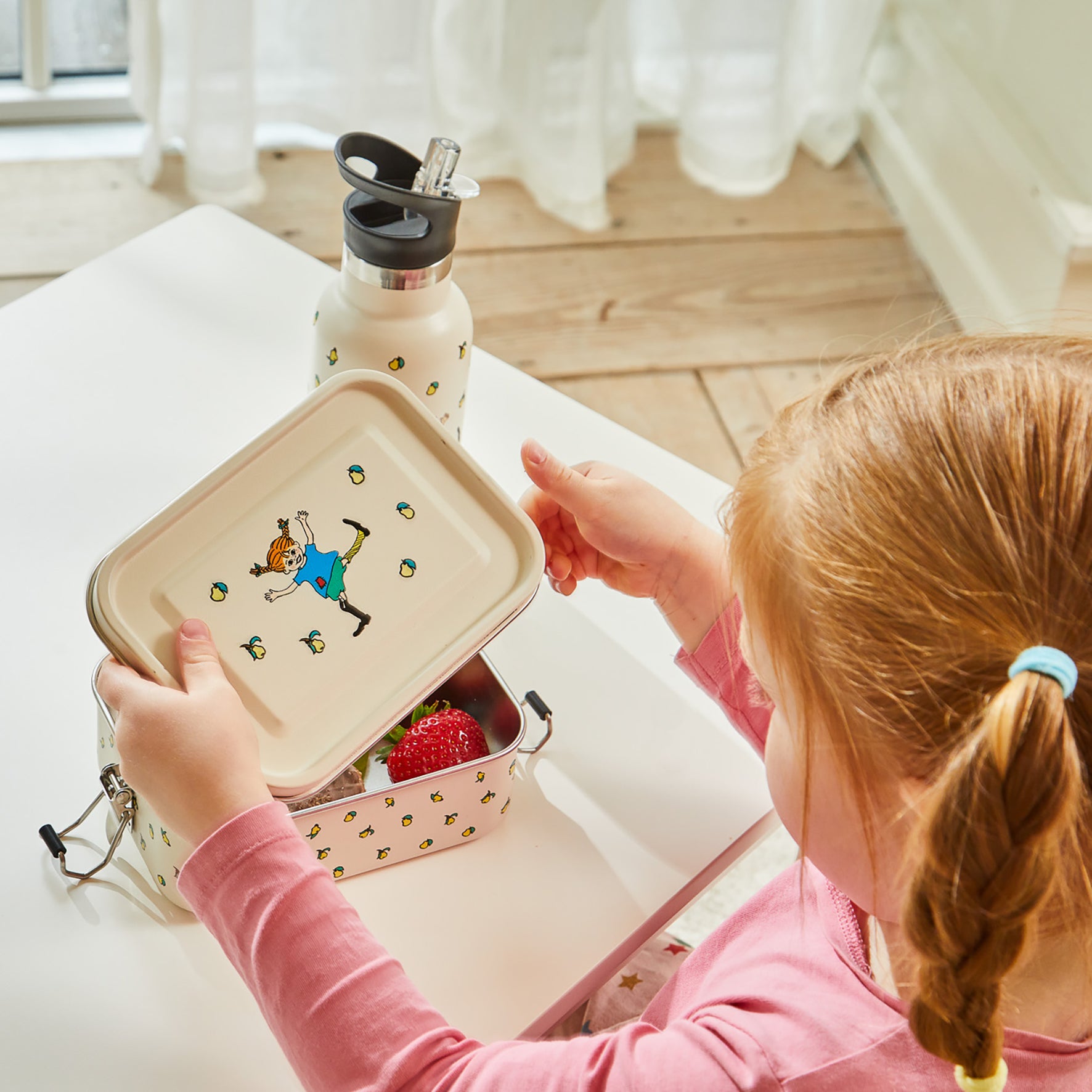 Denne Pippi madkasse i en fin cremefarve, dekoreret med Pippi illustrationer, kombinerer hverdagsfunktionalitet med tidløst design. Fremstillet i slidstærkt rustfrit stål er madkassen let, robust og skabt til daglig brug - hvad enten det er i skole, på arbejde, på udflugter eller til udendørs eventyr.