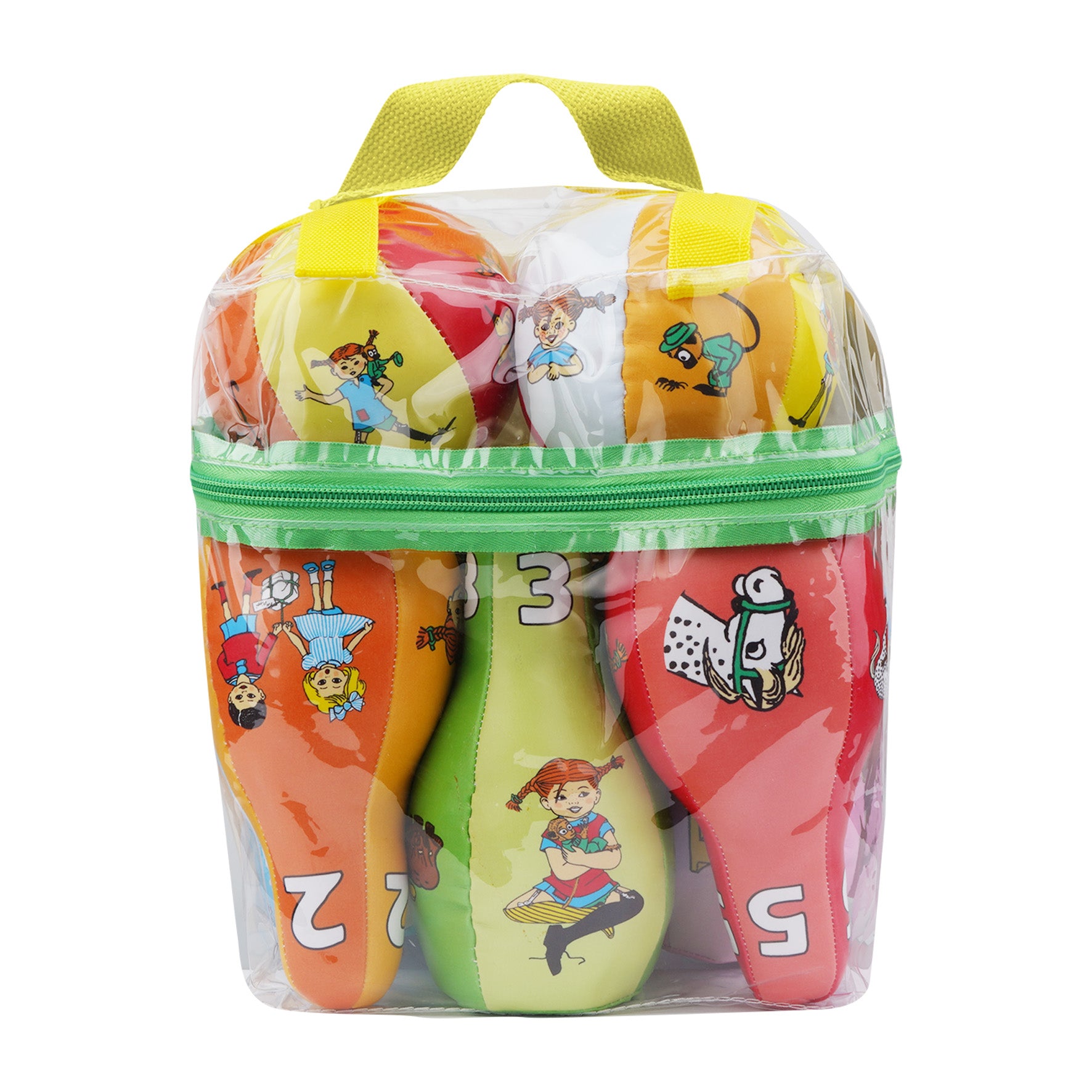 Spil bowling med Pippi Langstrømpe med dette farverige og bløde bowlingsæt som er sjovt at røre ved og lege med for selv de helt mindste. Det fine sæt har bløde bolde og bløde kegler, som gør det til et perfekte indendørs bowlingspil. Bowlingsættet fås i en praktisk opbevaringspose med hank så det er nemt at transportere. Alle dele er dekoreret med søde illustrationer af Pippi Langstrømpe.