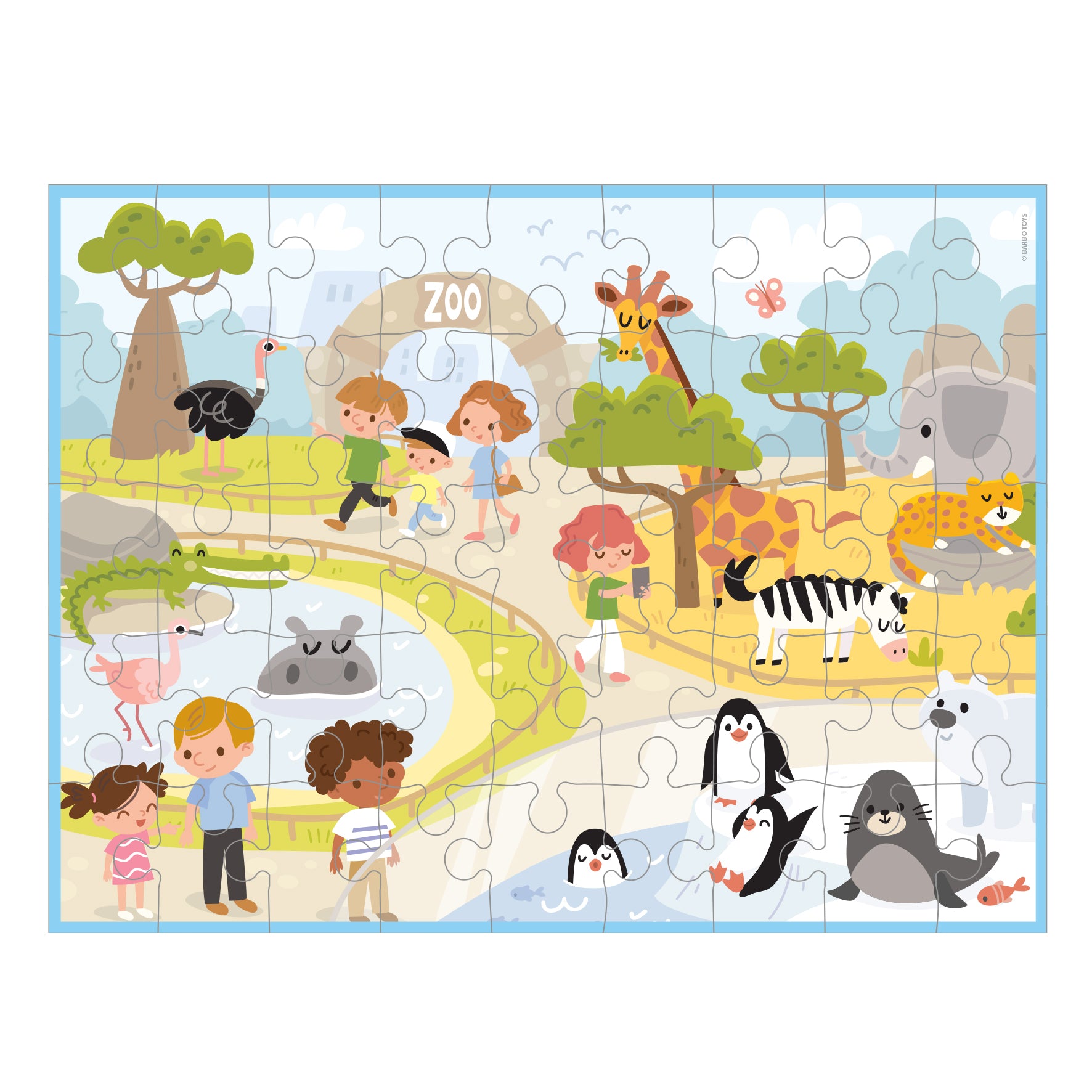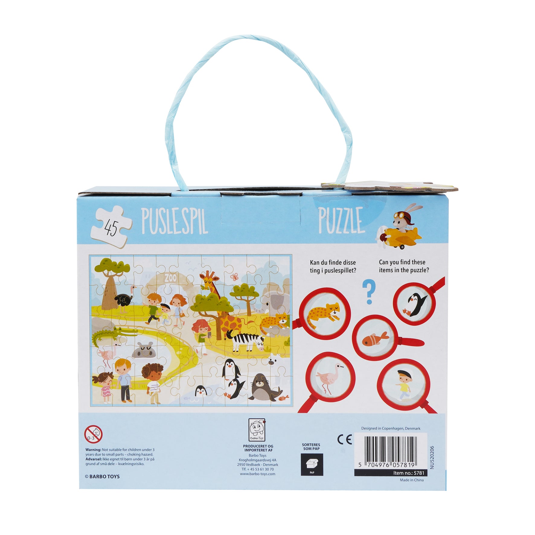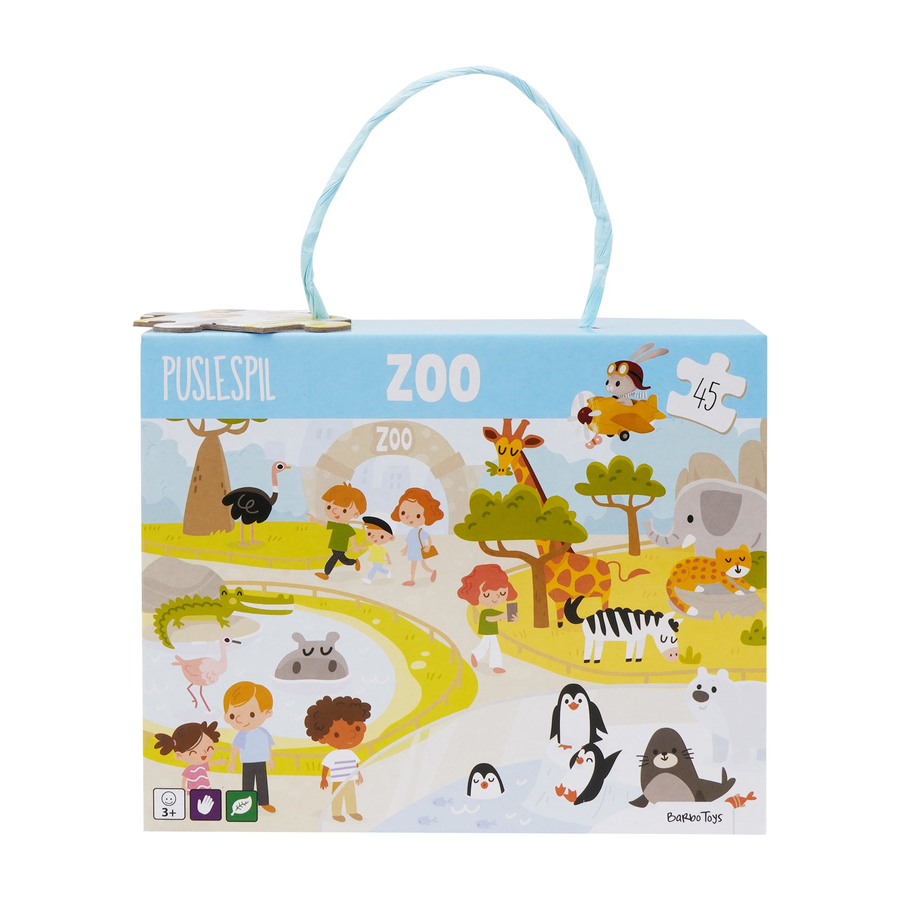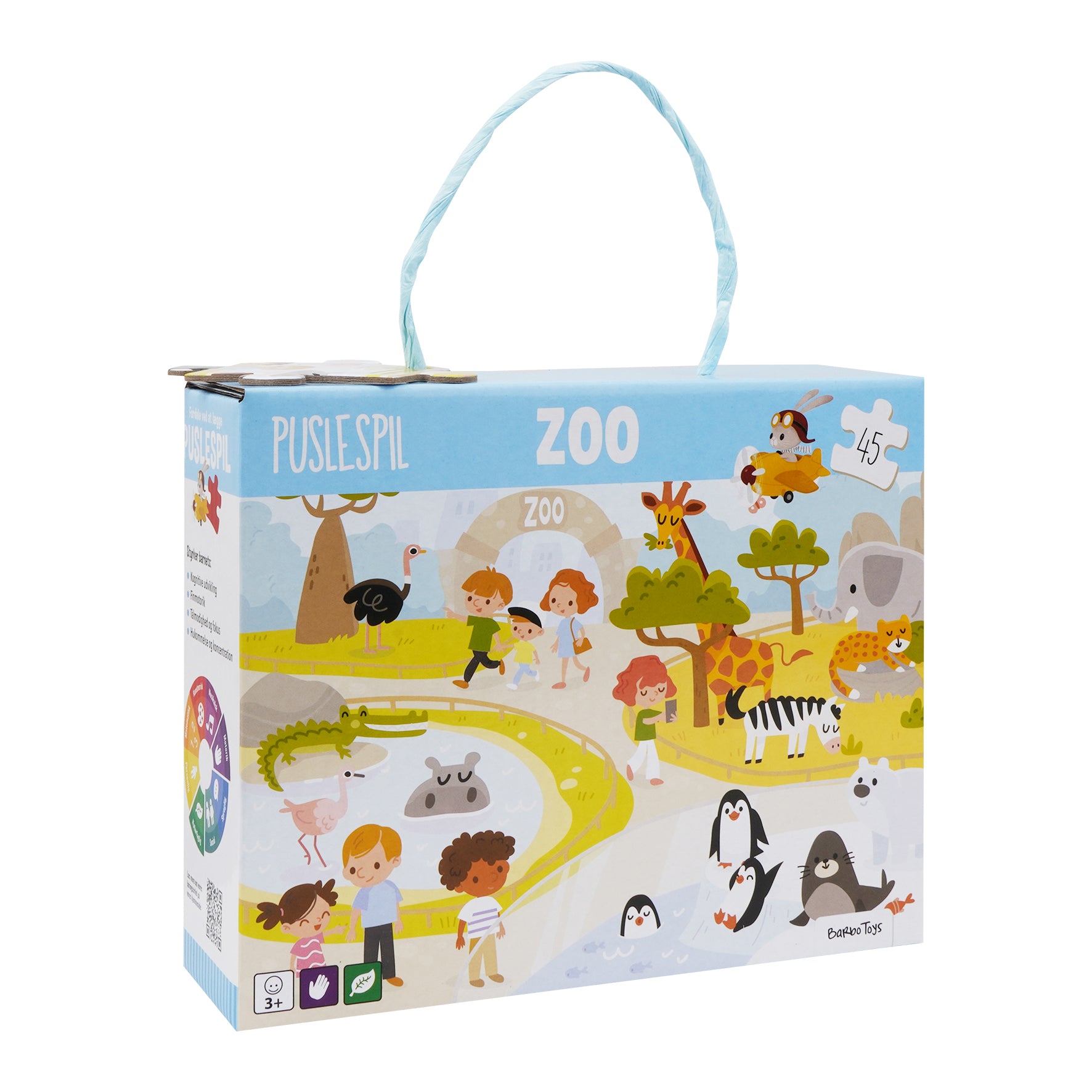Puslespil boks – Zoo er et spændende puslespil, der bringer glæden ved et zoo-besøg til live. Med 45 brikker tilbyder puslespillet en sjov udfordring, samtidig med at det styrker problemløsning, koncentration og finmotorik. Den smukt illustrerede scene viser et væld af zoo-dyr, legende børn og frodige omgivelser, hvilket gør det både underholdende og visuelt stimulerende.