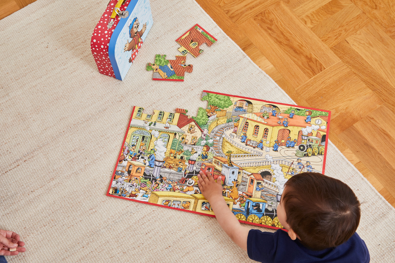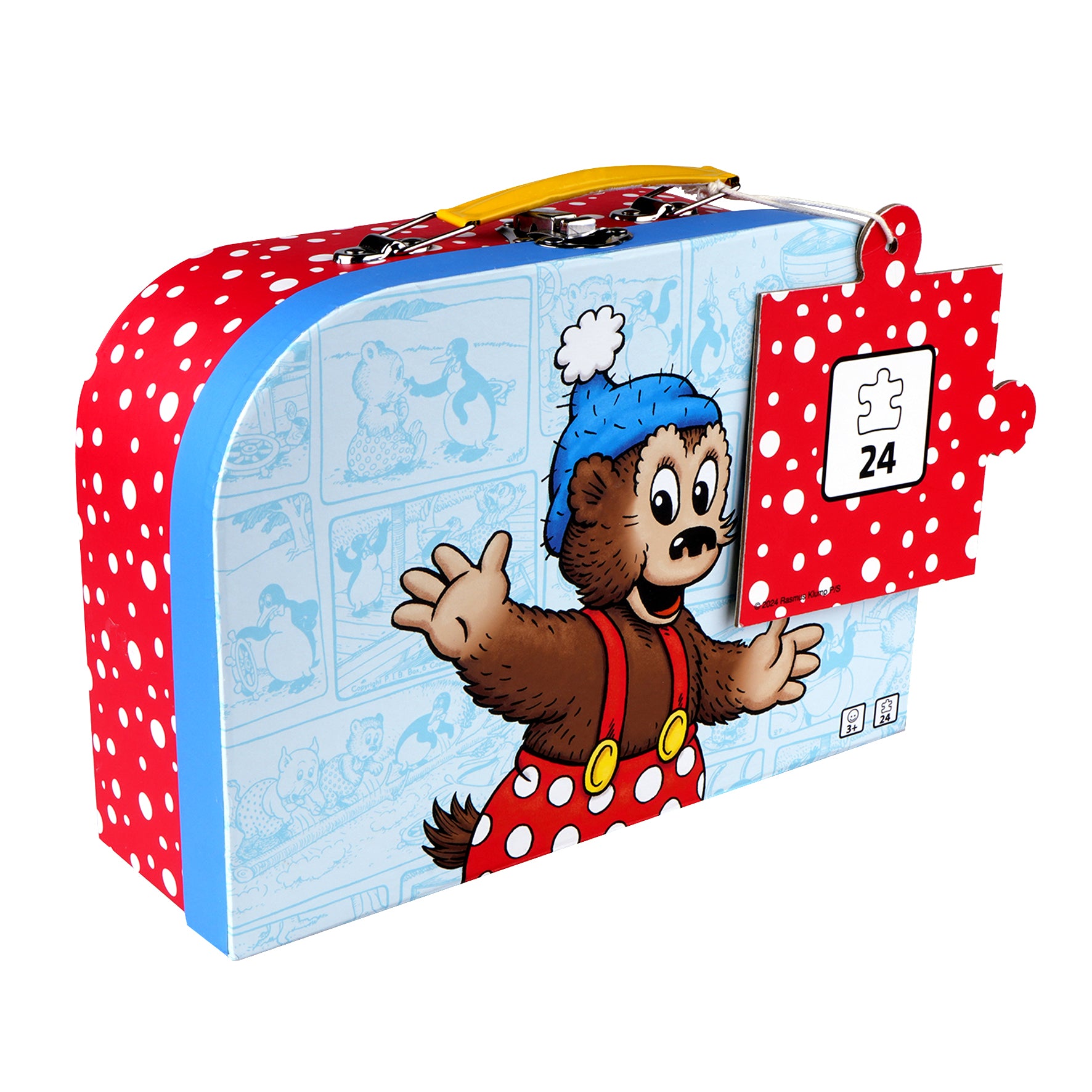 Træd ind i Rasmus Klumps verden med vores fortryllende kuffert med puslespil!