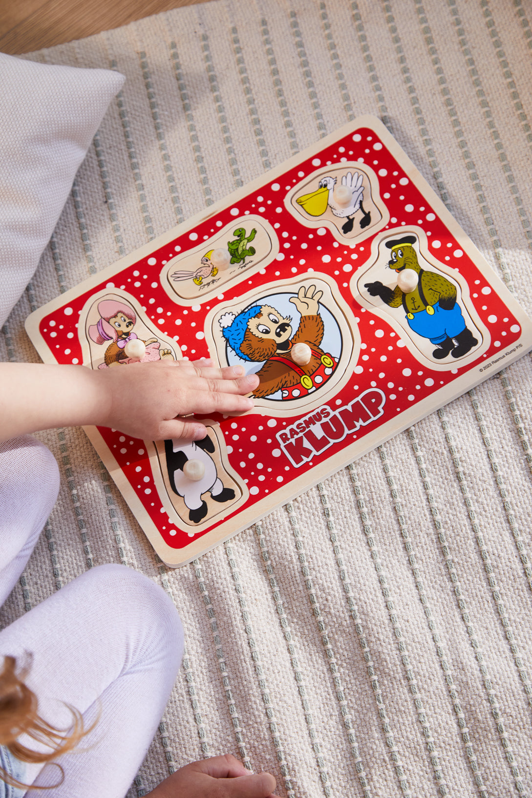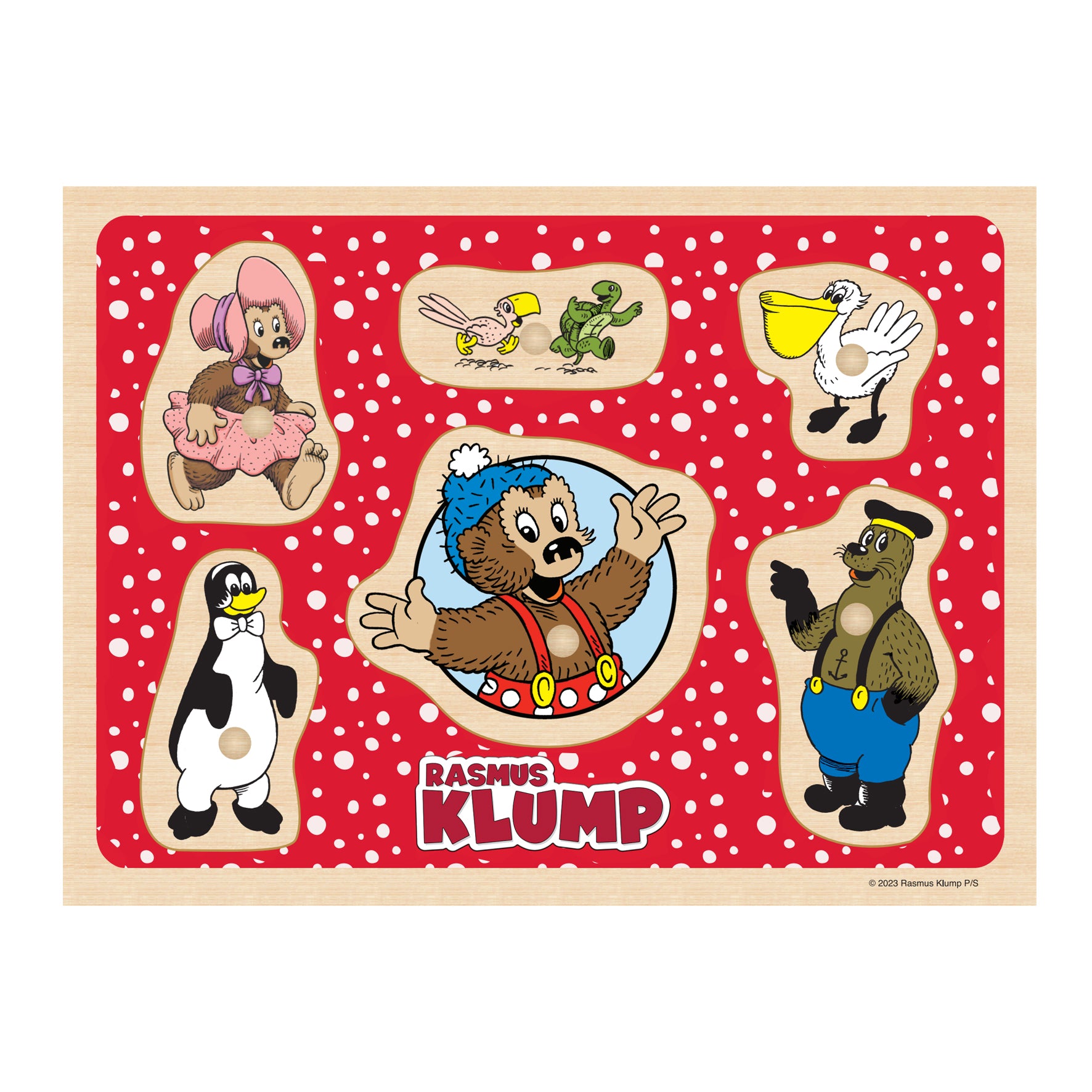 Dette farverige træpuslespil indeholder seks søde brikker med Rasmus Klump og hans venner. De børnevenlige træhåndtag gør det nemt for små hænder at placere brikkerne korrekt i puslespillet.