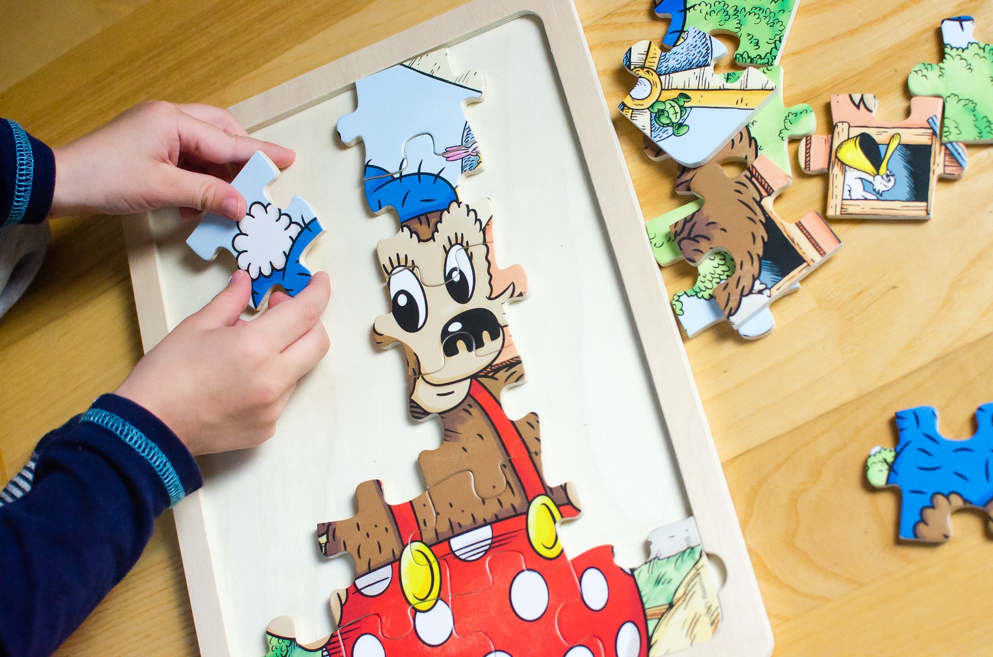 Puslespil aktiverer begge hjernehalvdele, da børn både visualiserer det færdige billede og finder ud af, hvordan brikkerne passer sammen. De forbedrer også hånd-øje-koordination, farvegenkendelse, hukommelse, tålmodighed og koncentration.