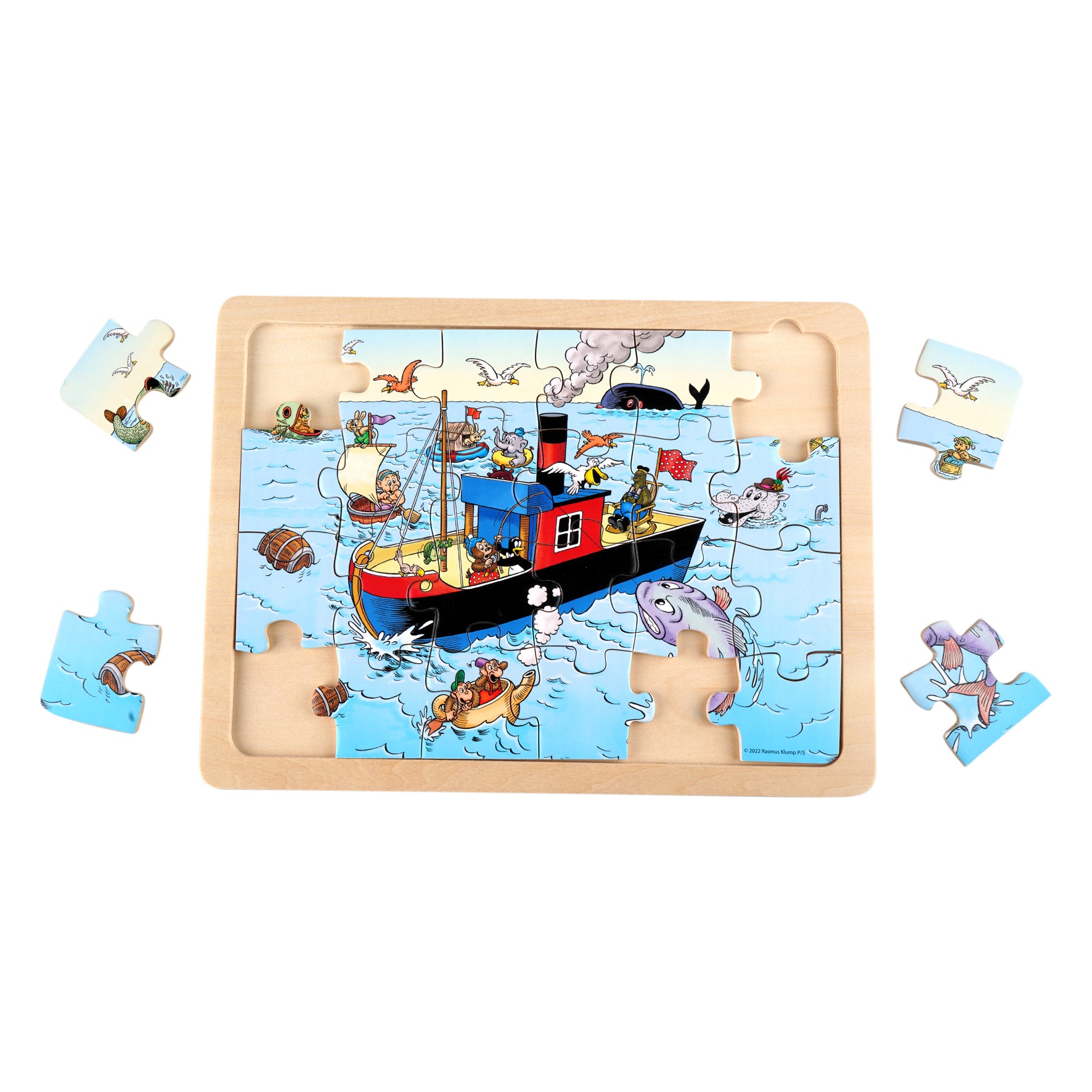Smukt Træpuslespil i Ramme – Rasmus Klump og Skibet Mary på Eventyr
