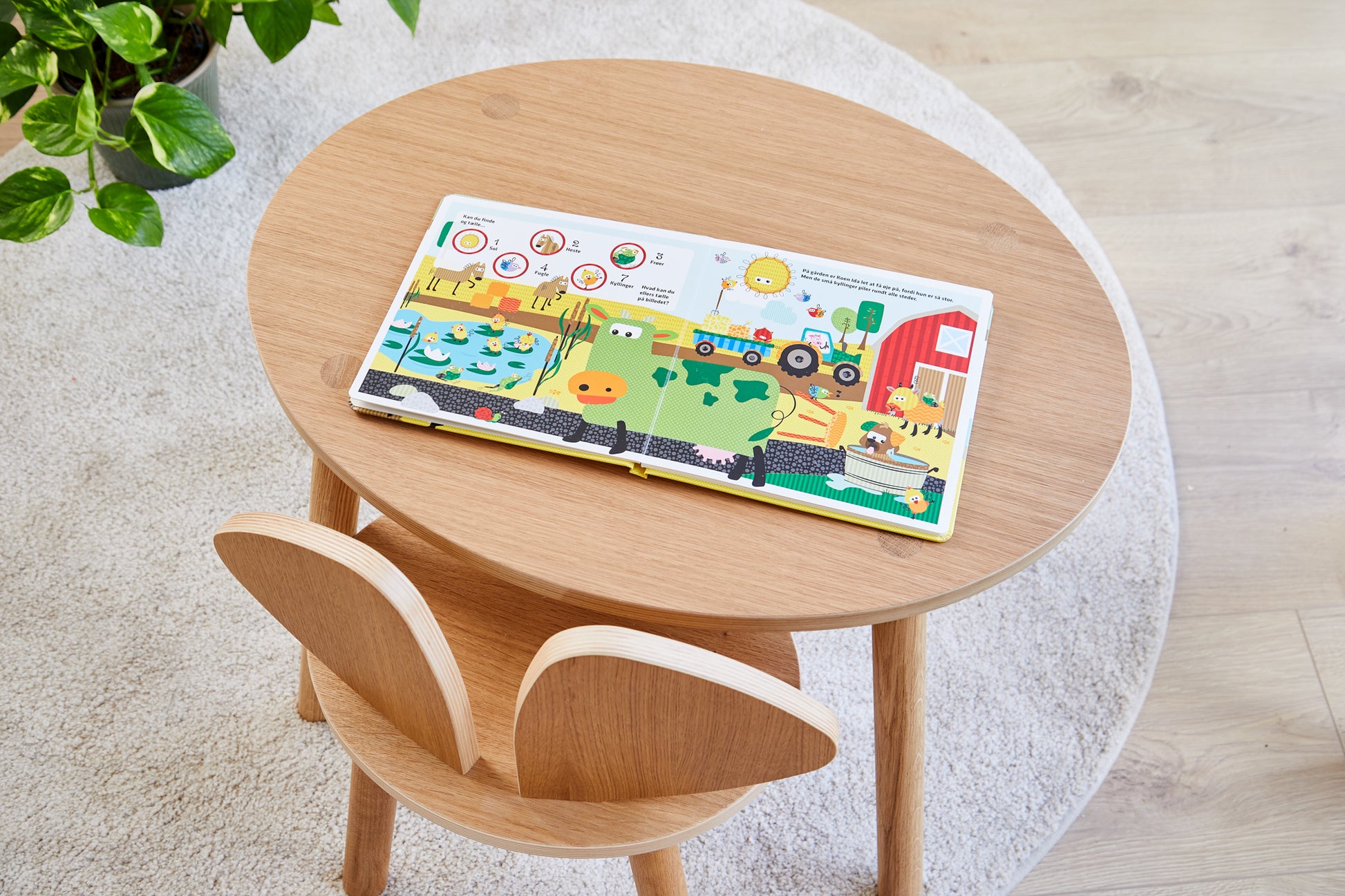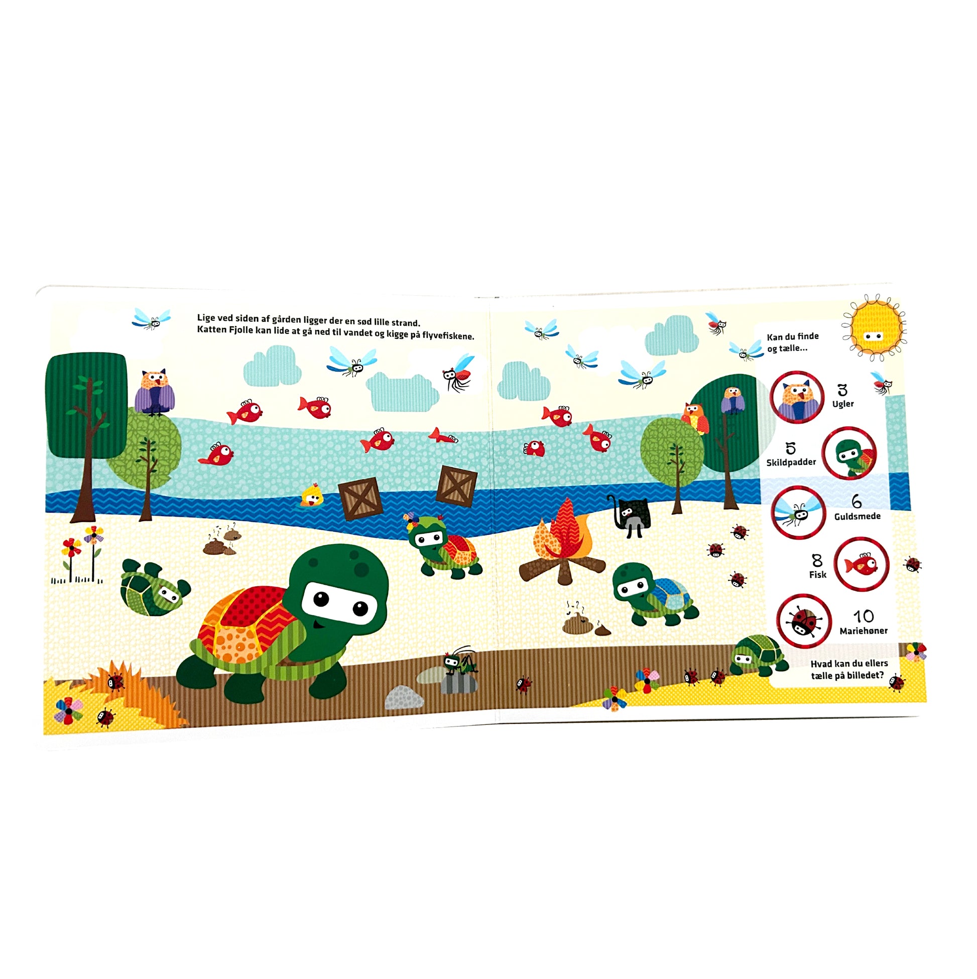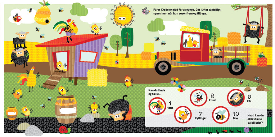 Er du god til at finde ting? Se hvor hurtigt, du kan finde og tælle de forskellige dyr på gården og mon du kan finde mariehønen på forsiden af bogen?
