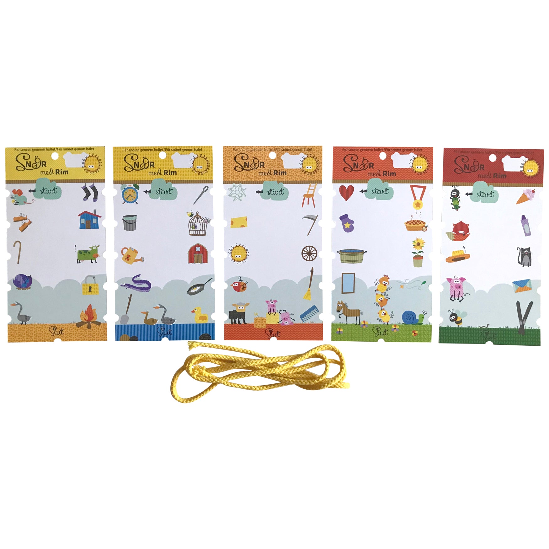 Lær klokken med kort og snor. De fem kort i æsken og tilhørende snor en ideel og sjov start for dit barn til at lære klokken på en sjov og hyggelig måde Snoren føres igennem hullet øverst på et af kortene med de fine og finurlige illustrationer, og nu skal snoren vikles fra det digitale ur til det matchene analoge ur. På bagsiden er der et mønster, hvor barnet selv kan checke, om det har tænkt rigtigt. Når første kort er blevet udfordret, sætter barnet snoren i et af de andre kort. Dette produkt er ideelt til at lære klokken gennem hyggelig leg. Før snoren igennem hullet på toppen af kortet Begynd ved START og før snoren ned til det resultat der passer. Snoren føres nu bagom og op til det næste regnestykke mod venstre.. Derefter snører du de øvrige kort med hinanden Ved SLUT vendes kortet rundt De søde tegninger med masser af farver og dyr er med til at hjælpe dit barn med at huske indlæringen.