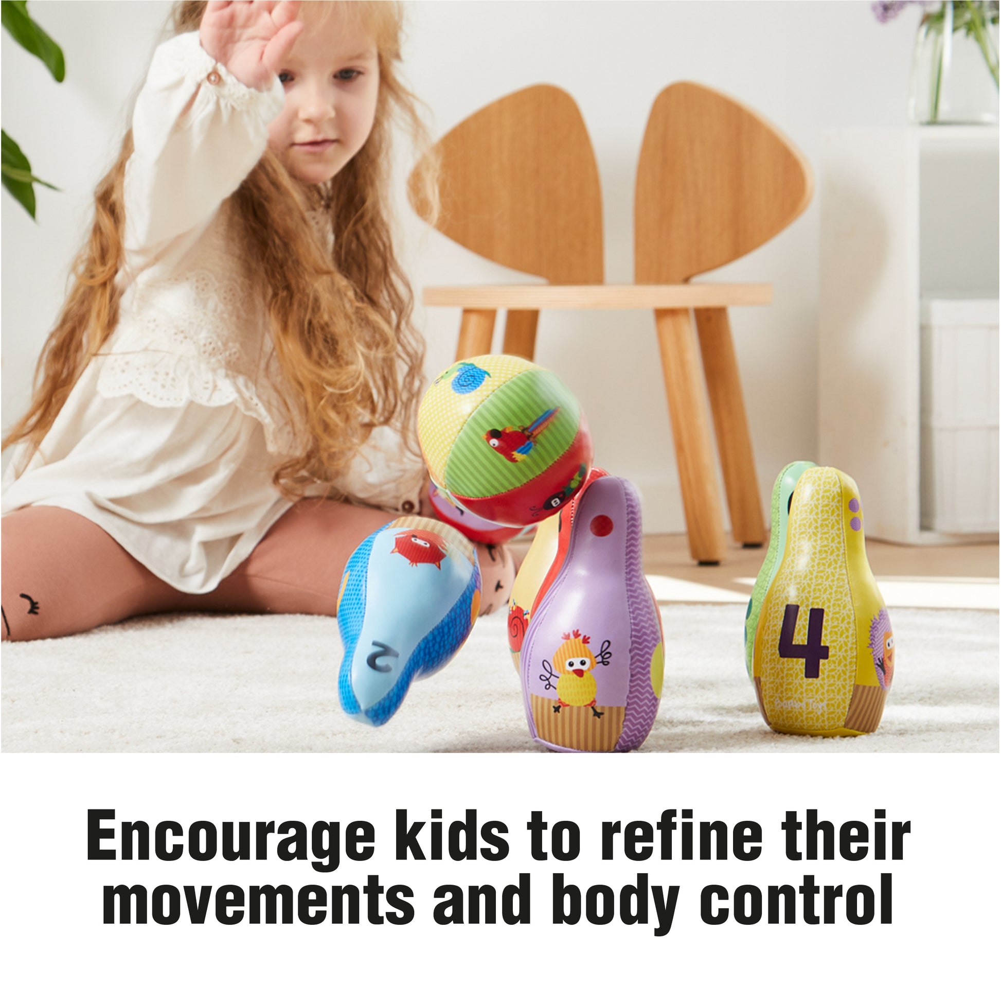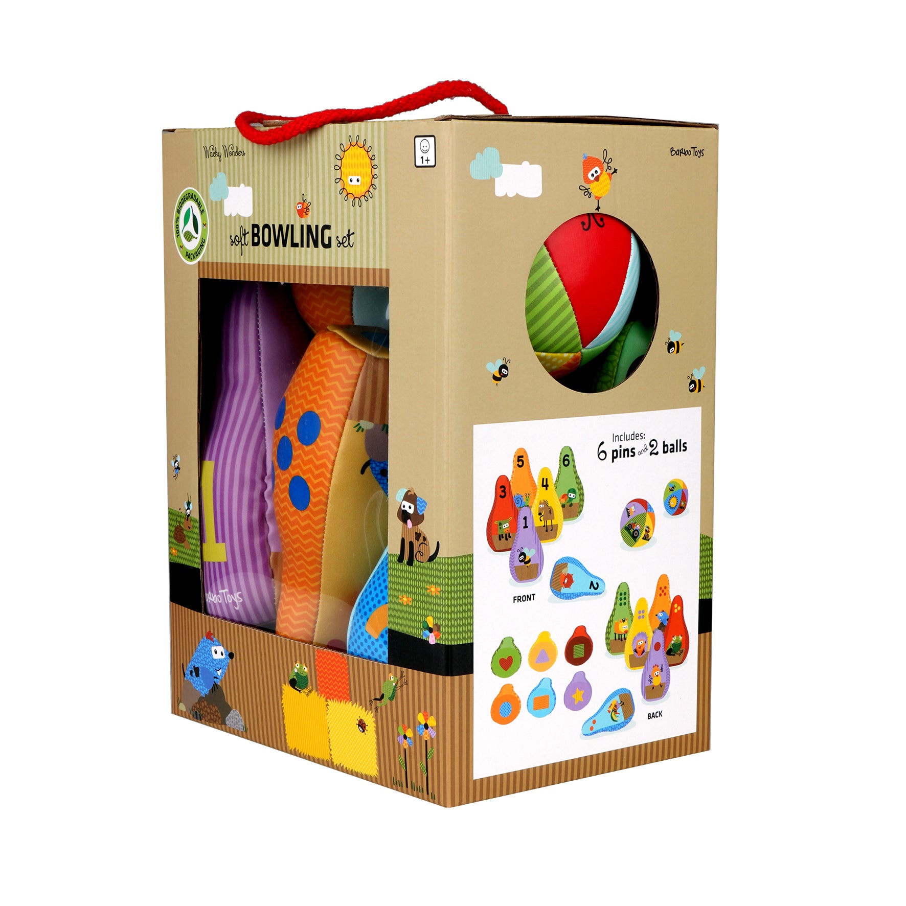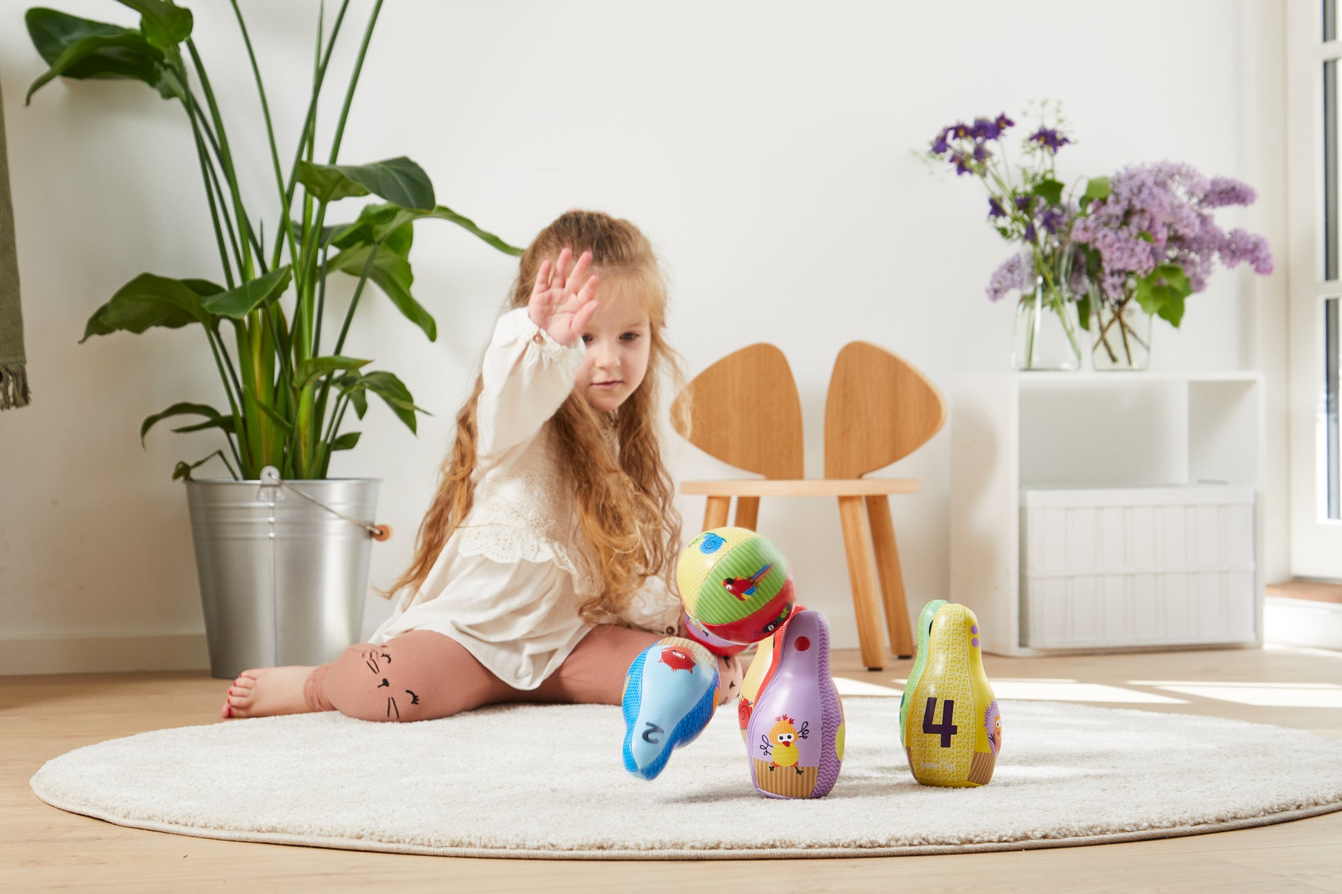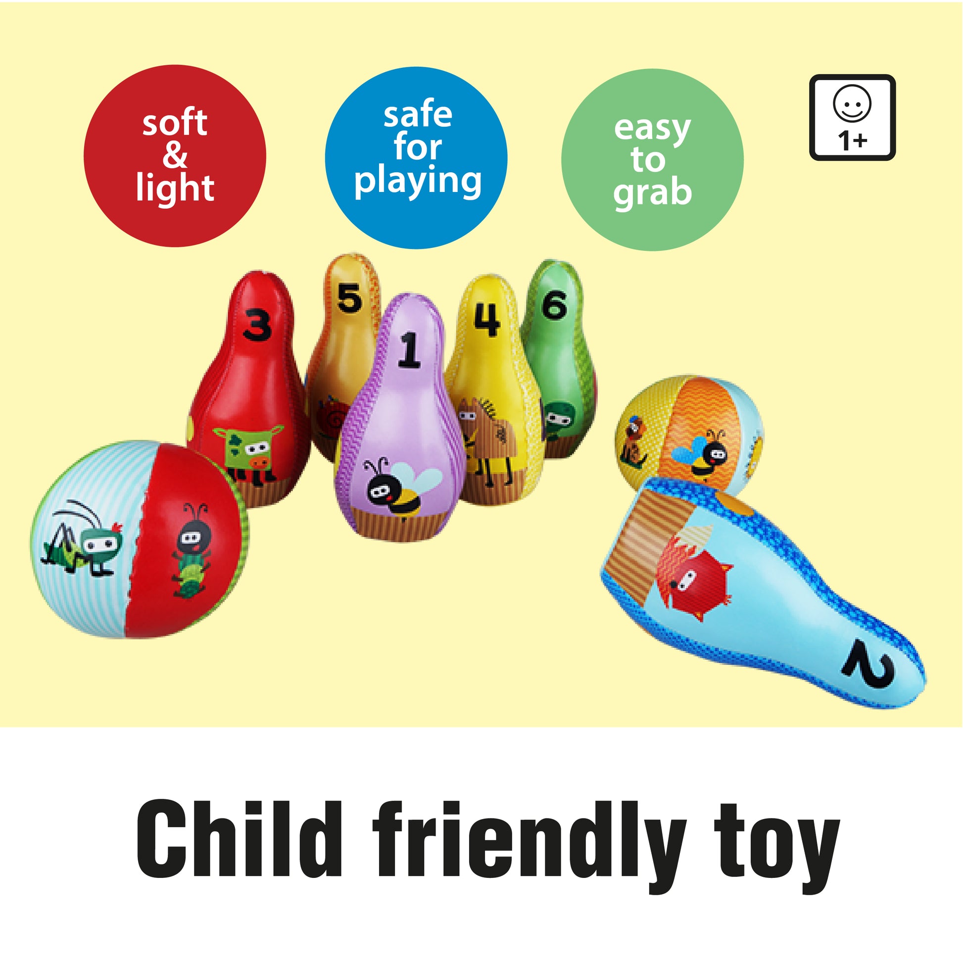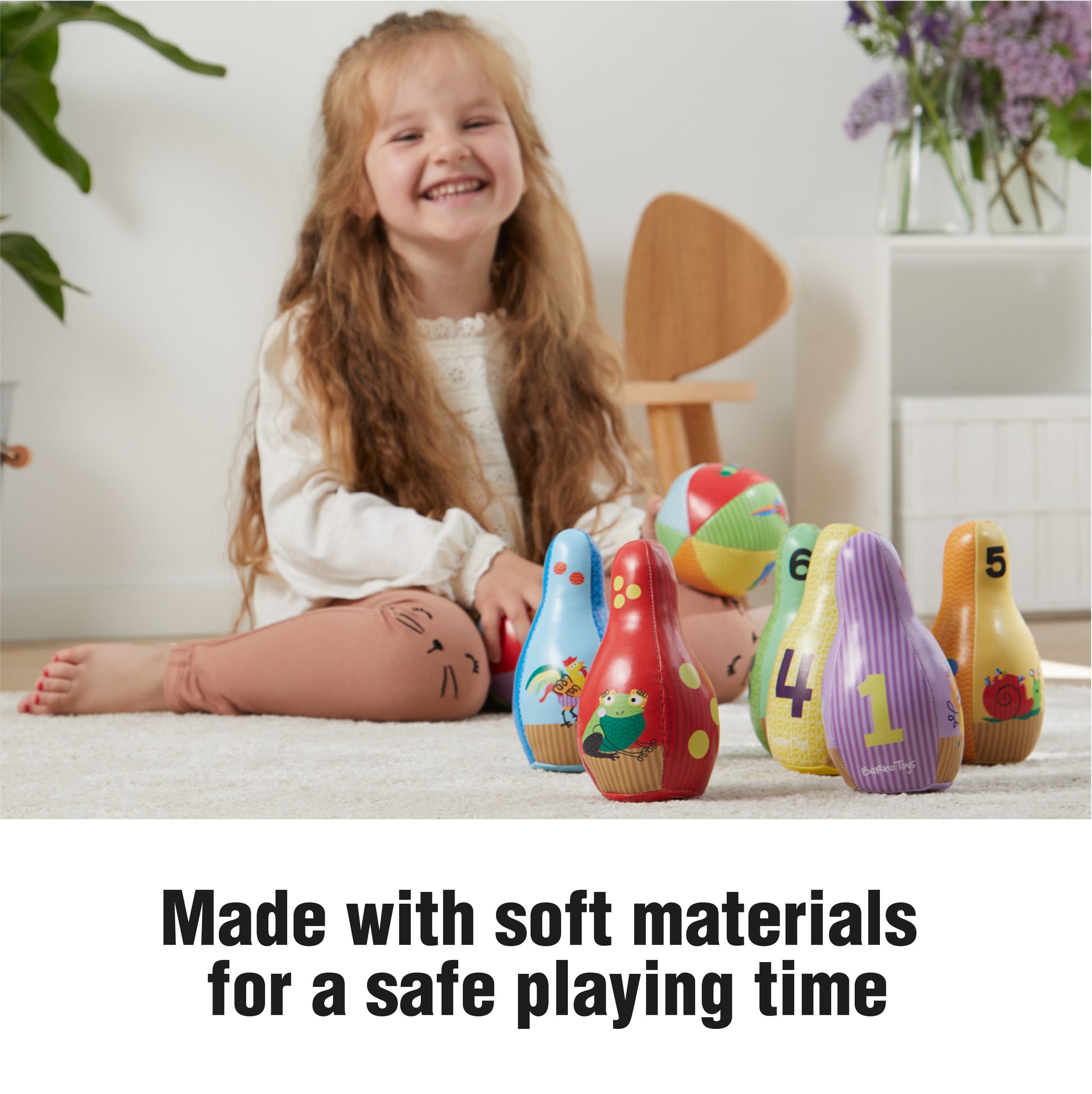 Dette farverige og bløde bowlingsæt er sjovt at røre ved og lege med for selv de helt mindste. Det fine sæt har bløde bolde og bløde kegler, som gør det til et perfekte indendørs bowlingspil.
