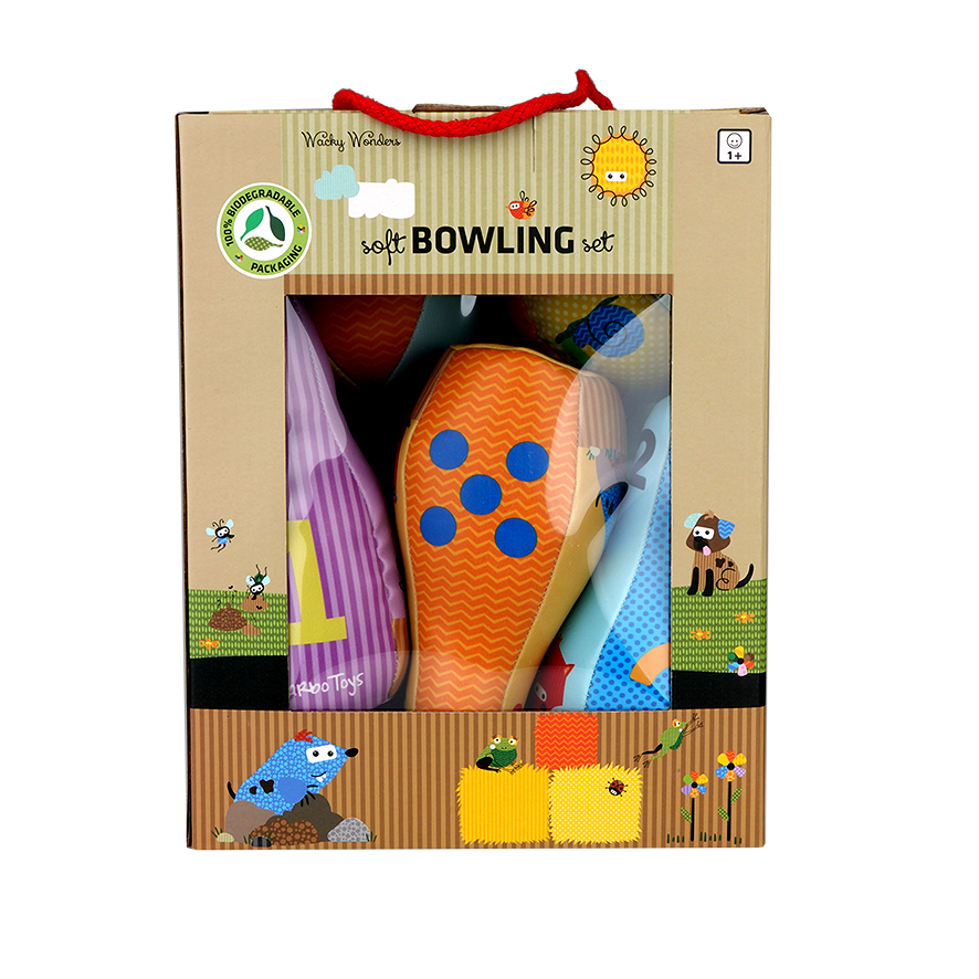 Bowling sættet fås i en praktisk opbevaringspose med hank så det er nemt at transportere. Alle dele er dekoreret med søde illustrationer af Wacky Wonders.